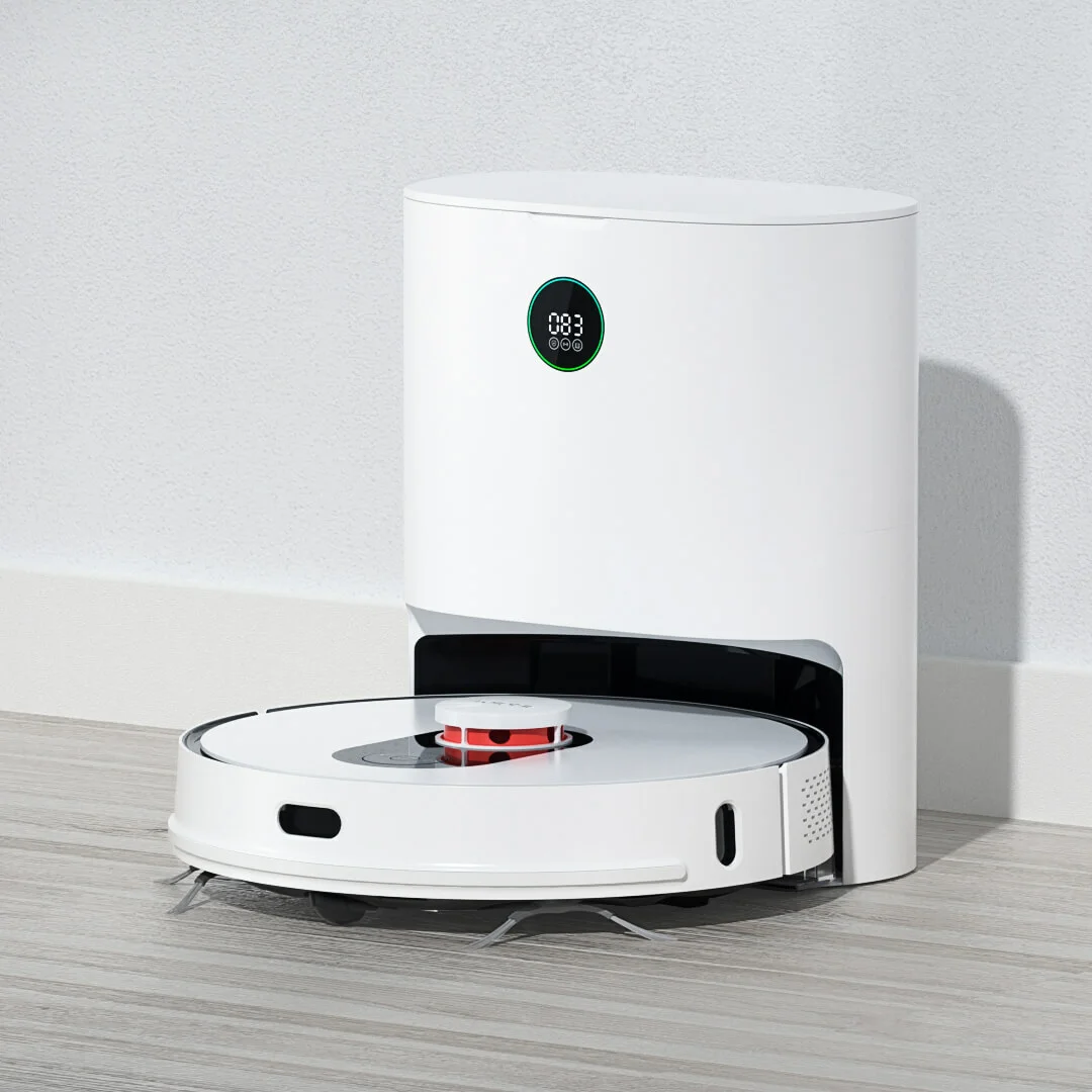 Внутри зарядной базы находится насос, который высасывает собранный мусор из контейнера гаджета и помещает его в специальный мешок объемом 3 л (поставляется в комплекте). Одного мешка может хватить на целый месяц. На корпусе зарядной станции расположен небольшой светодиодный дисплей, который показывает наполненность мусорного мешка и уровень заряда батареи.