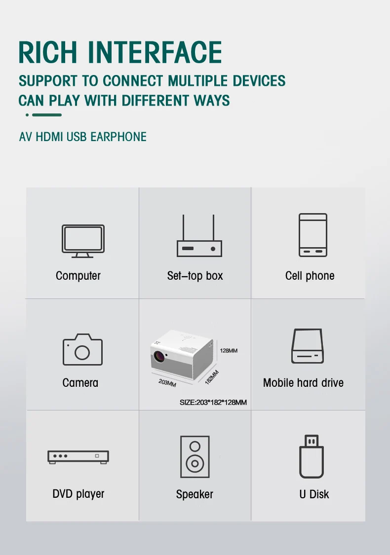 Android версииВстроенная ОС Android 6,0. Поддержка просмотра видео онлайнСинхронизации экран версияПроектор T10 позволяет легко подключаться к вашим устройствам на базе IOS или Android через сеть Wi-Fi или просто через кабель USB/LightningБазовая версияПодключение компьютеров, ноутбуков, телефонов, XBOX, PS, переключателей и т. д. устройств через HD порт и USB порт