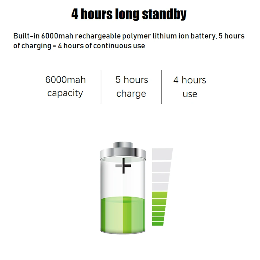 Встроенный перезаряжаемый литиевый аккумулятор емкостью 6000 мАч, полностью заряжен в течение 4 часов непрерывного использования при максимальной яркости экрана.