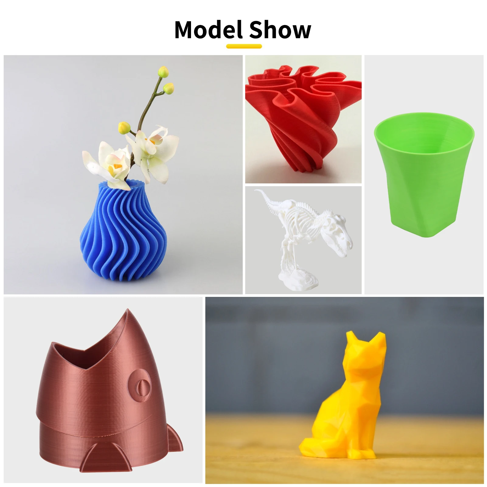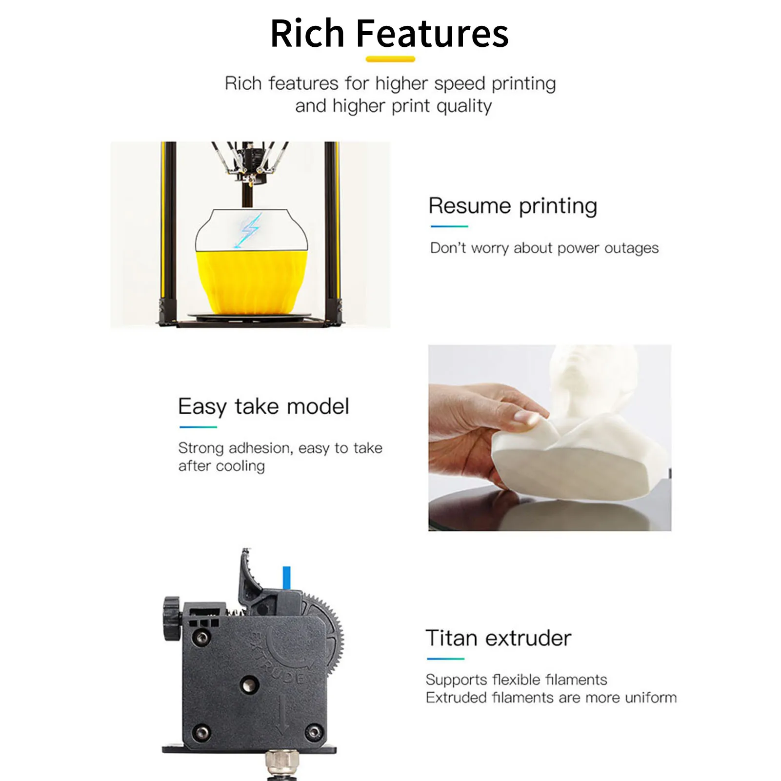 С сенсорным экраном, новый пользовательский интерфейс, полный цвет. С бесшумным драйвером TMC2208, держитесь подальше от шума. Экструдер, поддерживает гибкие нити, экструдированные нити более однородны. Сильное сцепление, легко взять модель при охлаждении платформы.