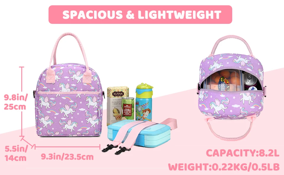 Сумка для ланча-бокса имеет основное отделение на молнии, передний карман для маленьких предметов первой необходимости 2 способа переноски. Благодаря съемному плечевому ремню ваш малыш может вместить сумку для ланча через плечо. Регулируемый плечевой ремень позволяет свободно ходить.