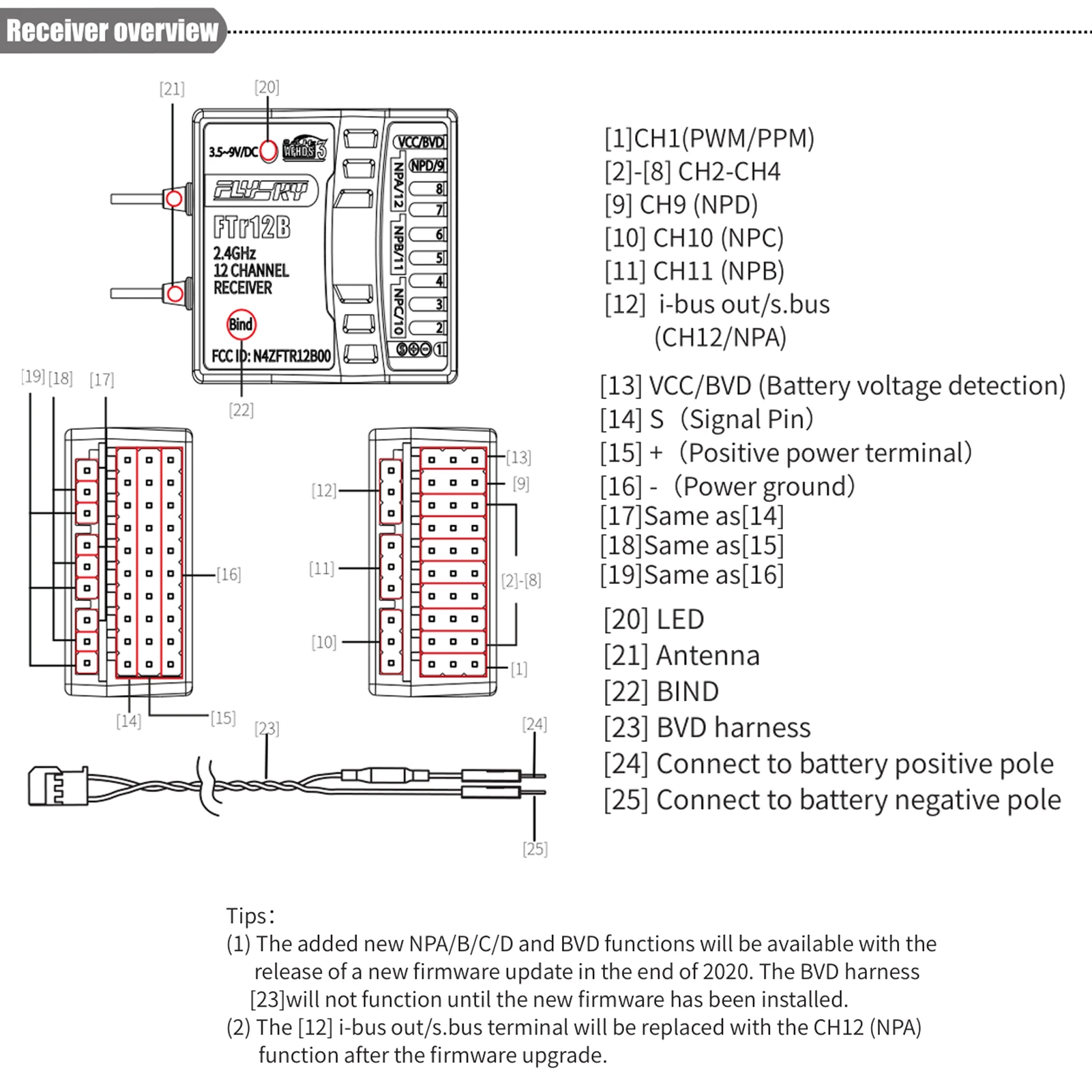 The FTr12B receiver adopts Flysky's third-generation automatic frequency hopping digital system (AFHDS 3), which features dual antennas and bidirectional data transmission commonly known as telemetry plus an i-bus out/s.bus terminal and PWM/PPM switching at CH1. Compatible with all AFHDS 3 transmitters and RF modules.