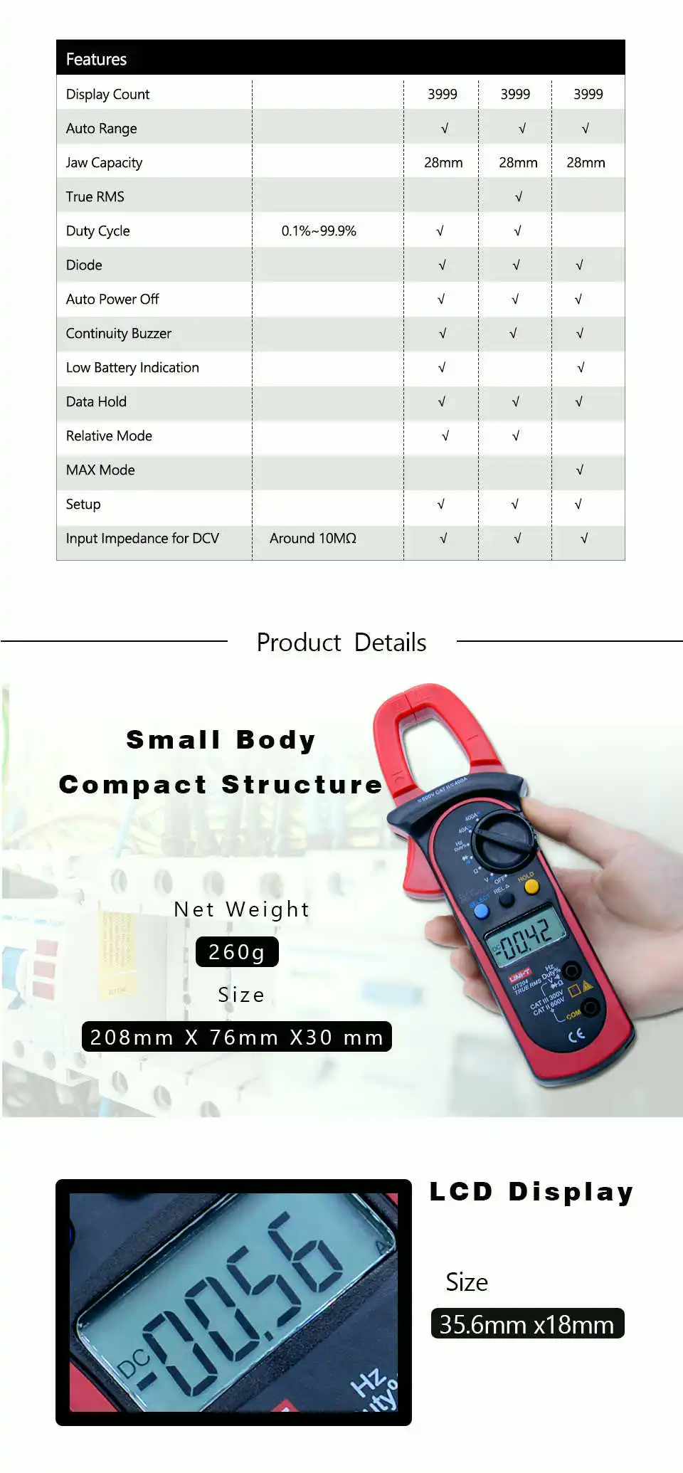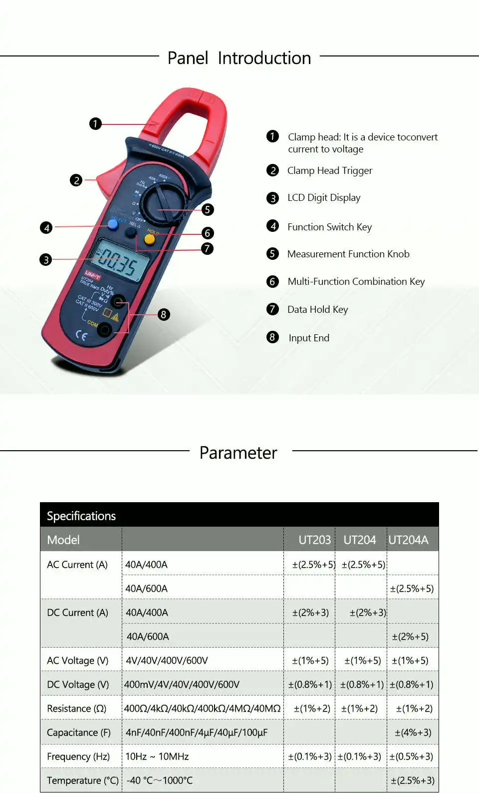UT204A от UNI-T представляет собой Автоматический диапазон 600A цифровой клещи с функцией измерения температуры и емкости.