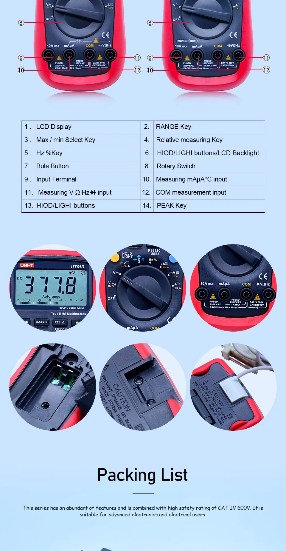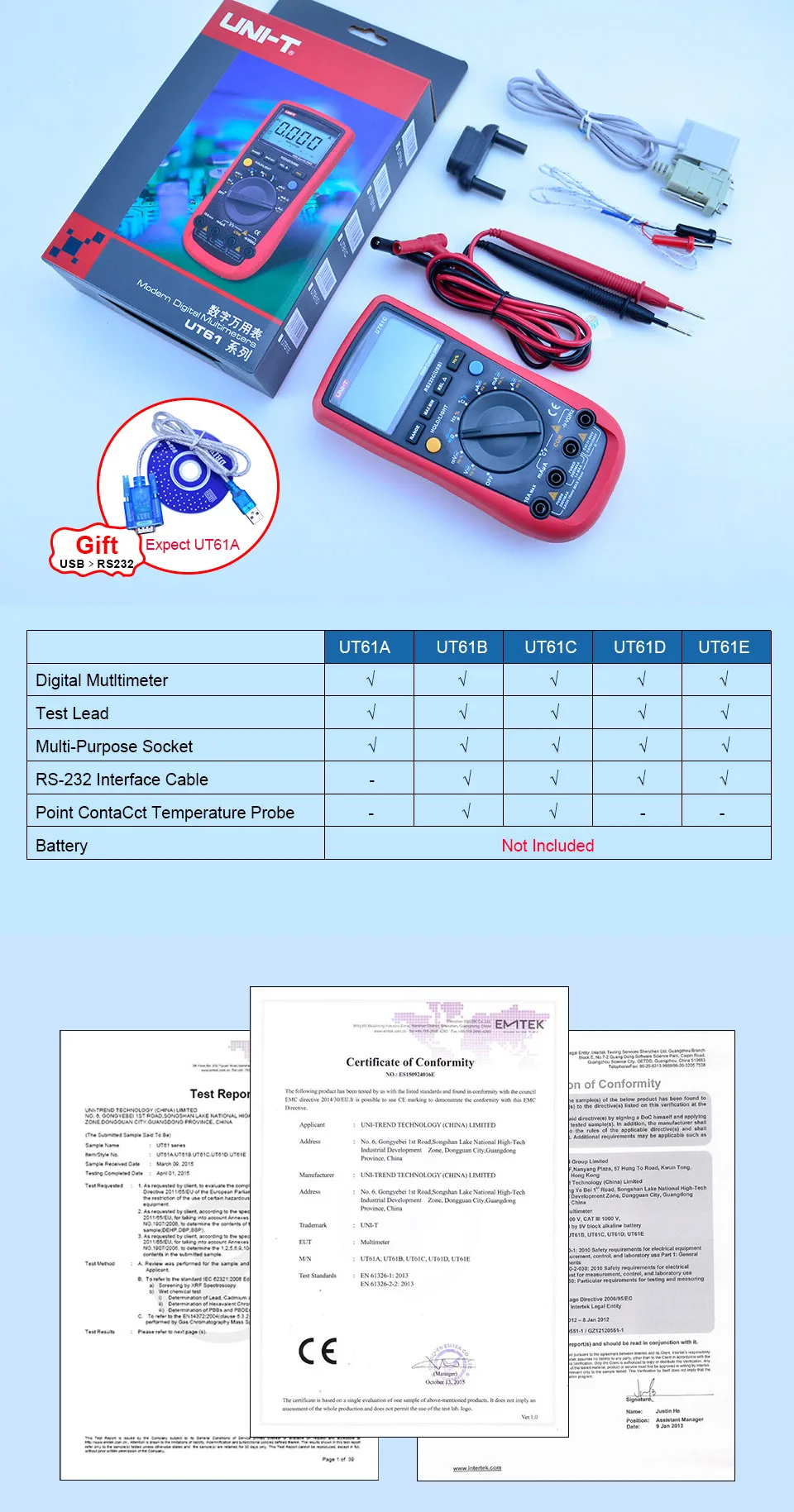 Посылка:1 * Цифровой мультиметр UT61B 1 * Тестовые провода 1 * Многоцелевой разъем 1 * программный CD 1 * кабель для RS-232 1 * Руководство пользователя на английском языке 1 * точечный контактный датчик температуры 1 * цветная коробка 1 * кабель USB для RS-232