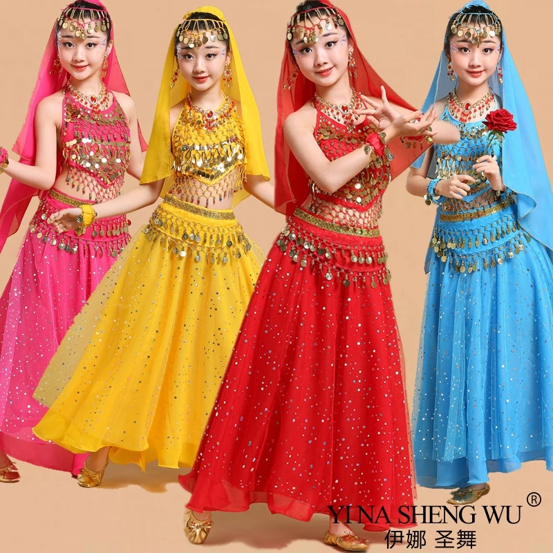 Танцевальный Костюм Болливуда для девочек; Комплект для взрослых детей; Индийское сари для танца живота; Детский шифоновый наряд; Вечерние костюмы на Хэллоуин