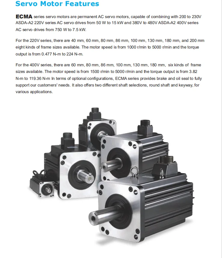 Особенности серводвигателя Серводвигатели серии ECMA являются постоянными серводвигателями переменного тока, способными сочетать с 200 до 230 В ASDA-A2 серводвигатель переменного тока серии 220 В от 50 Вт до 15 кВт и 380 В до 480 В ASDA-A2 400 в серии Серводвигатель переменного тока с накопители от 750 Вт до 7,5 кВт. Для серии 220 В есть 40 мм, 60 мм, 80 мм, 86 мм, 100 мм, 130 мм, 180 мм и 200 мм Доступно восемь видов размеров оправы. Скорость двигателя от 1000 об/мин до 5000 об/мин и крутящий момент Выход от 0,477 N-m до 224 N-m. Для серии 400 В есть 60 мм, 80 мм, 86 мм, 100 мм, 130 мм, 180 мм, шесть видов рамок Доступные размеры. Скорость двигателя от 1500 об/мин до 5000 об/мин, а выход крутящего момента от 3,82 N-m до 119,36 N-m с точки зрения дополнительных конфигураций, серия ECMA обеспечивает тормоз и сальник для полного Поддержка потребностей наших клиентов. Он также предлагает два различных выбора вала, круглый вал и keyway, для Различные приложения.