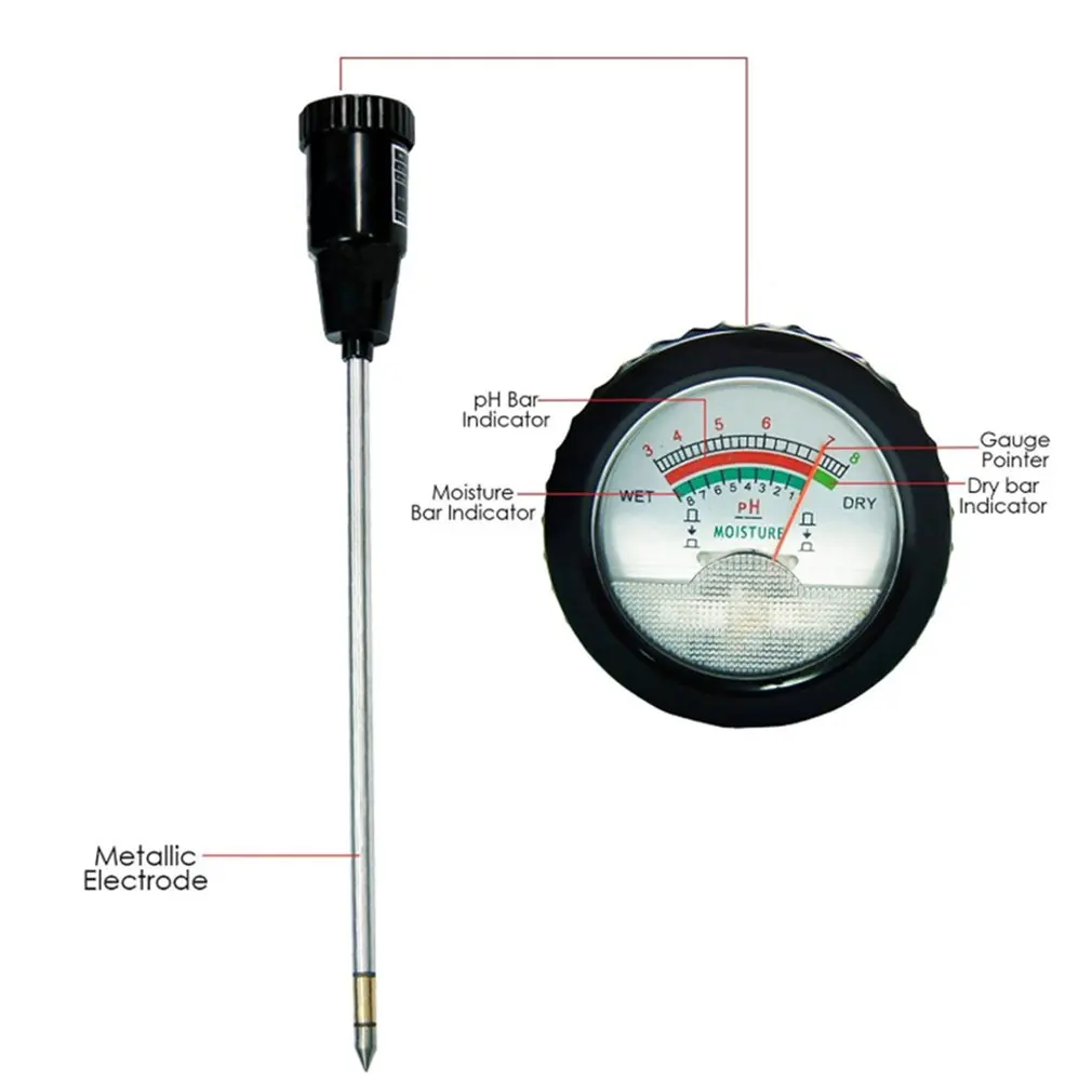 Этот продукт обеспечивает быструю, простую и точную проверку уровня pH почвы (кислотности и щелочности) и уровня влажности.