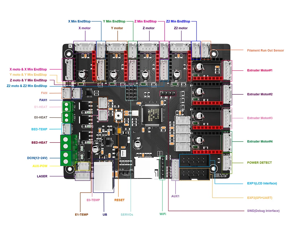 Для X, Y, Z, Z2 моторного разъема, он также обеспечивает пять 6 контактных (PH2.0-6PIN) разъемов, которые сочетают провода моторов и концевые переключатели проводов, чтобы сделать проводку проще.