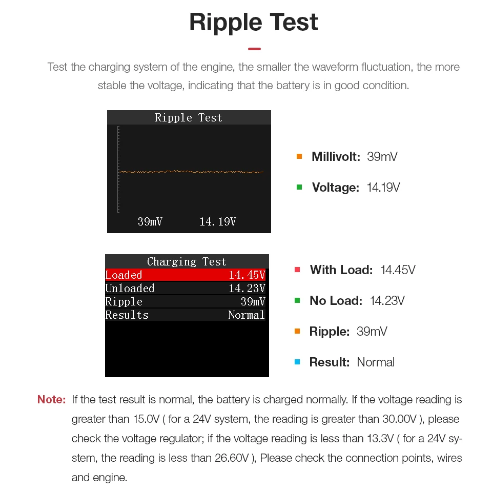 Проверьте систему зарядки двигателя, чем меньше колебание формы волны, тем стабильнее напряжение, что указывает на то, что аккумулятор находится в хорошем состоянии.