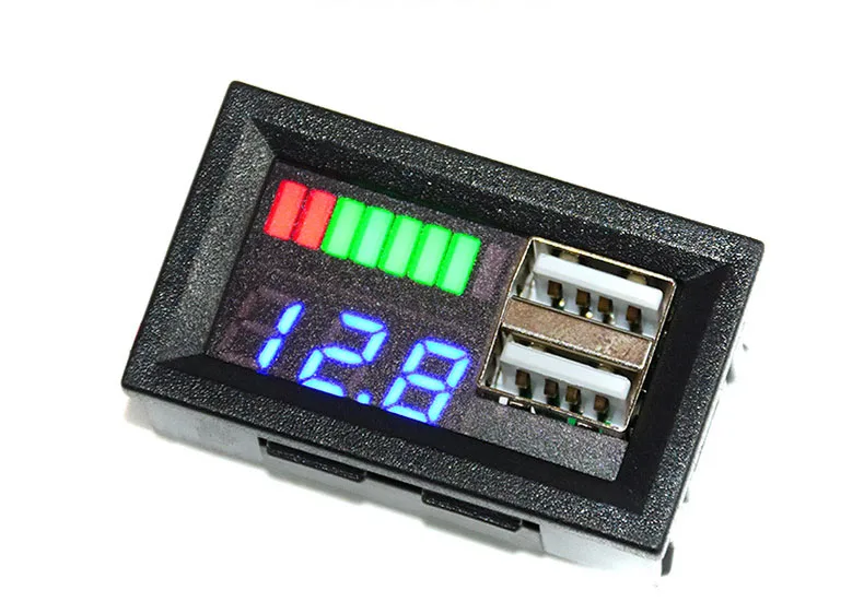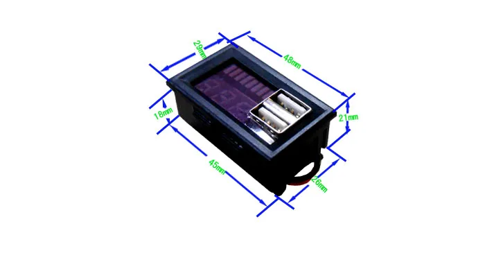 1. Input voltage limit value (the peak value that can be seen by the oscilloscope): 1-3S lithium batteries, 12V lead acid (not mark 30V ); 18V (the average value of the multimeter does not exceed 15V) ; 3S lithium batteries 12V lead acid (mark 30V) ; 4-7S lithium battery, 24V lead-acid: 36V (the average value that the multimeter can see does not exceed 30V) 2. Static input current: 5-25MA, the lower the battery voltage, the lower the current. 3. USB output: 5V/2A (one USB is set for iphone identification, the other is set for Android identification) 4. The USB step-down efficiency is up to 96% (because of the synchronous rectification circuit, the step-down conversion efficiency is super high, and the heat is low. 5.8-segment power rate: 10% 25% 40% 50% 60% 75% 90% 100% 6, the accuracy of the voltmeter is about 2% 7Working temperature: -10~+65℃8 Working humidity: 10~80% (non-condensing) 9. Hole size: 45×26×18MM