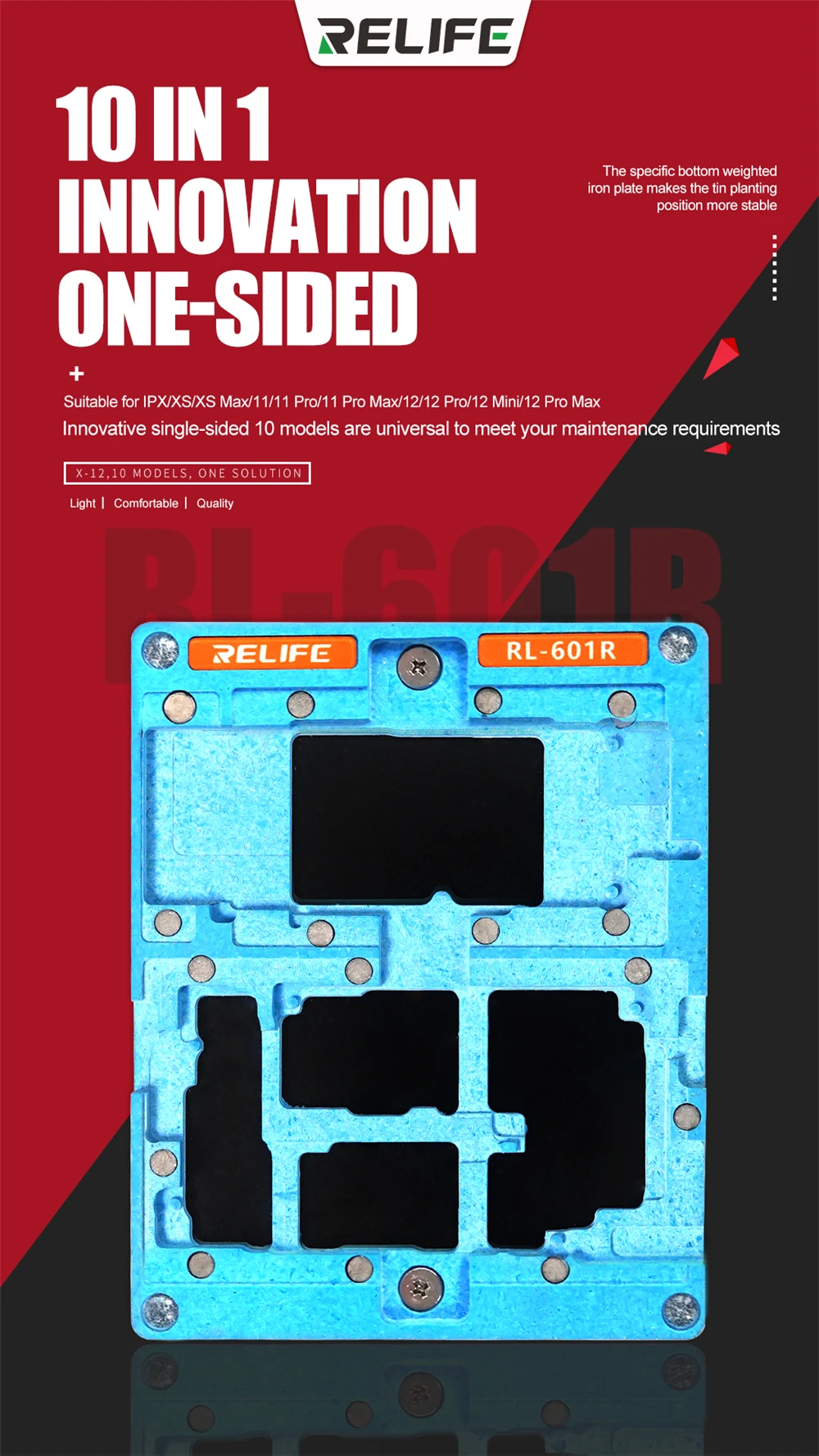 RL-601R посадка олова среднего размера подходит для IPX/XS Max/11/11 Pro/11 Pro Max/12/12 Pro/12 Mini/12 Pro Max · Точное позиционирование · Оловянная посадка быстро · Сильная Магнитная Адсорбция Несколько моделей: Инновационные односторонние 10 моделей универсальны для удовлетворения ваших потребностей в обслуживании Средний трафарет, RF доска, точный шаг отверстия Импортированная сталь, круглые и квадратные точные отверстия, делают жестяные шарики более округлыми и предотвращают Застревание сетки в жестяных шариках, встроенный высокотемпературный магнит, сильная Магнитная Адсорбция, точное позиционирование, отсутствие отклонений, высокая температура магнетизма без изменений Вес: около 290 г 130*114*26,5 мм/коробка Посылка включает в себя: крепление * 1/стальная сетка * 8/SIM Крышка для банки * 1 Информация о продукте Точная установка олова, простая эксплуатация, защита от барабана, рассеивание тепла Интегрированный позиционный столб из синтетического камня: точное позиционирование колонны на основании для фиксации материнской платы без переключения Оловянные шарики однородны и полны: анти-барабан, так что каждый шар припоя круглый и полный, для удовлетворения потребностей различных чипов Изолирующая Крышка для банки SIM: предотвращает попадание олова на материнскую плату на SIM держатель для карт, когда материнская плата Оловянная Высокопрочный толстый синтетический камень: основной корпус изготовлен из специального синтетического камня, обладает высокой термостойкостью и обеспечивает быстрое рассеивание тепла Силиконовые Нескользящие подушечки для ног, специальная утяжеленная пластина внизу: Силиконовые противоскользящие подушечки для ног используются в нижней части, чтобы эффективно изолировать температуру, противоскользящие и противоскользящие, чтобы положение посадки олова было более стабильным Подходит для IPX-12 серии: 10 в 1 средняя Оловянная посадка, x-12,10 моделей, один раствор Уникальный инновационный дизайн, эффективно повышает эффективность посадки олова Удельная Нижняя утяжеленная железная пластина делает положение посадки олова более стабильным Толщина всего 0,12 мм