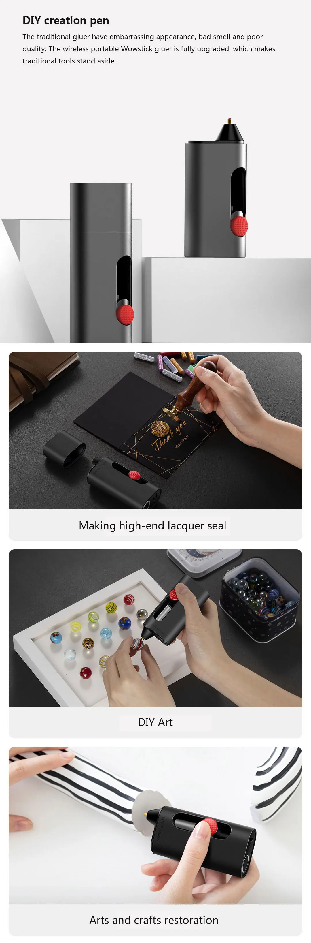 The traditional gluer have embarrassing appearance, bad smell and poor quality. The wireless portable Wowstick gluer is fully upgraded, which makes traditional tools stand aside.