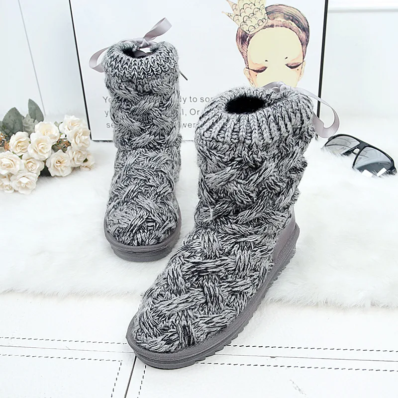 Новинка 2021 года; Креативные зимние сапоги; Женская шерстяная обувь из вязаного и бархата на шнуровке с бантом; Черная нескользящая обувь из хлопка с высоким голенищем