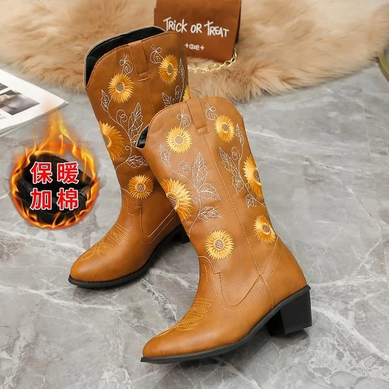 Европейский и американский стиль; Новый стиль; Милые и красивые ковбойские ботинки на толстой подошве с вышивкой; Модные ботинки в западном стиле с круглым носком в стиле ретро