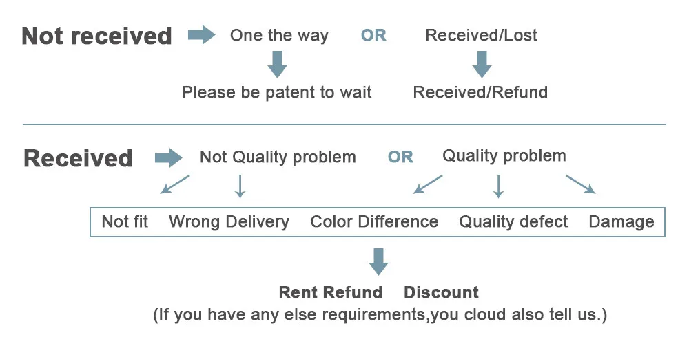 2. Если товар поврежден во время транспортировки или не может быть использован в обычном режиме, пожалуйста, свяжитесь с нами реальные фотографии товаров, и мы вернем вам деньги.