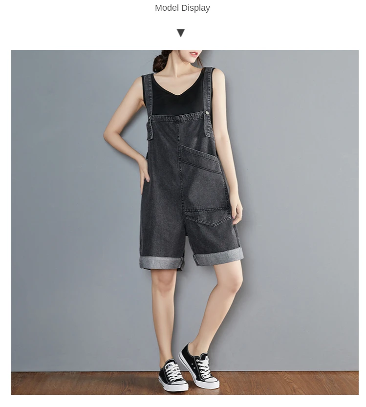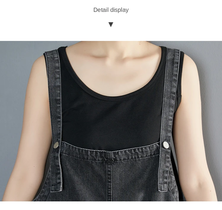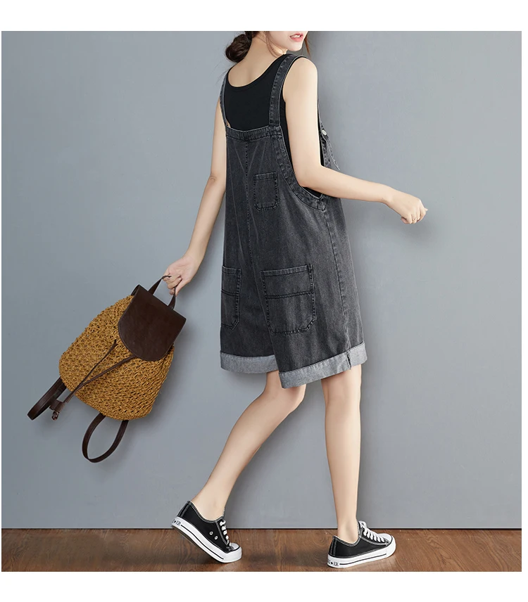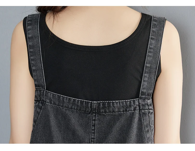Женский джинсовый комбинезон без рукавов черный Свободный с карманами в уличном