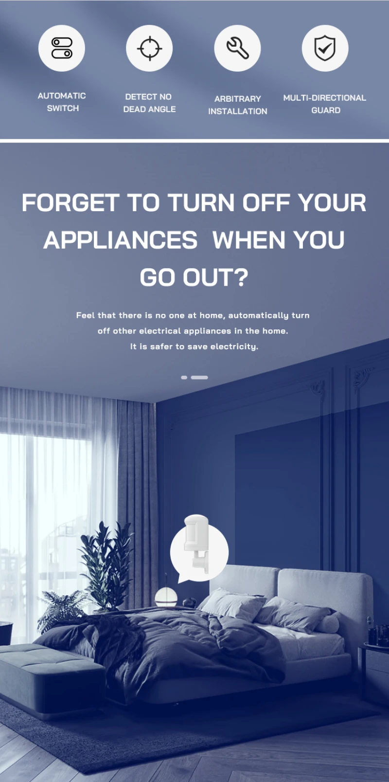 Install multiple sensors at different locations at the door, kitchen, bedroom, etc. at the same time. When you open the door, the living room light will automatically turn on; when you leave the kitchen, the kitchen socket will automatically cut off; when you wake up at night, the desk lamp will automatically turn on... through linkage Other smart home devices, wherever you go, smart life can follow.