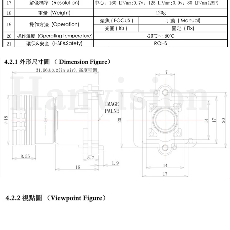 * Special made with F0.95 for starlight capture purpose, * 1/2.7" format, use for smaller size image sensor (1/2.8", 1/2.9" , 1/3" , 1/4" e.g.) will get smaller viewing angle. * Plastic body, 2.0MP glasses optical LENs.