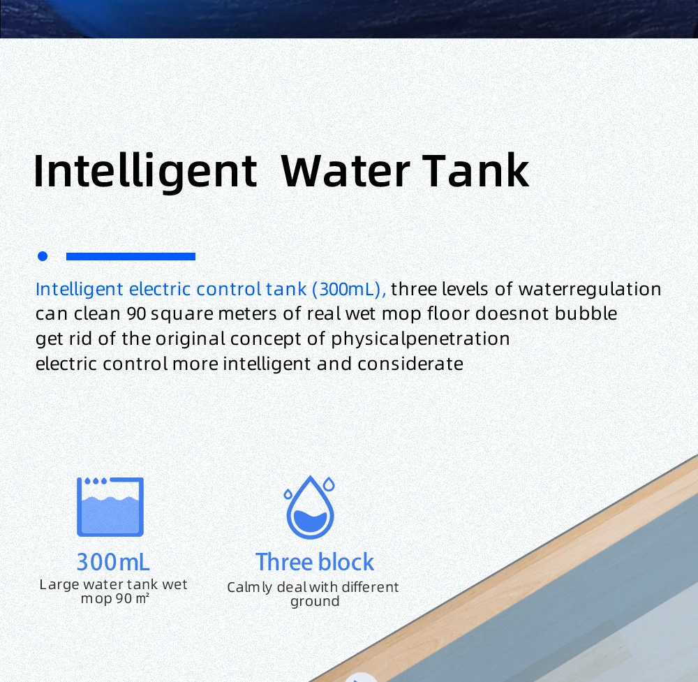 Интеллектуальный электронный резервуар для воды (300 мл), трехуровневая регулировка объема воды, настоящая влажная уборка без пены на полу, избавление от первоначальной концепции физического проникновения, электронное управление более интеллектуальное и продуманное.