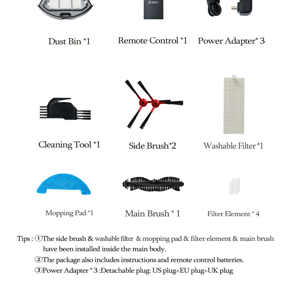 В комплекте: 1 вакуумный робот, 2 боковые щетки, 1 адаптер питания, 1 зарядная база, 1 пульт дистанционного управления, 2 батарейки для дистанционного управления AAA, 1 высокоэффективный HEPA-фильтр, 1 инструмент для очистки, 1 x пыль контейнер, 1 резервуар для воды, 1 тряпка для швабры, 1 многоязычное пользовательское описание