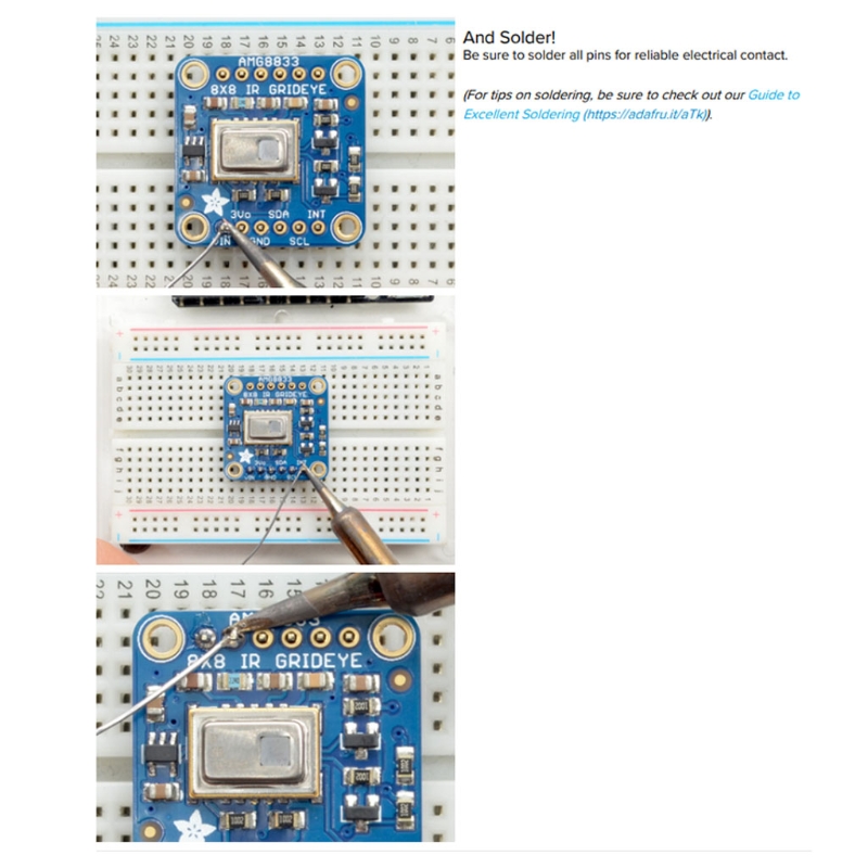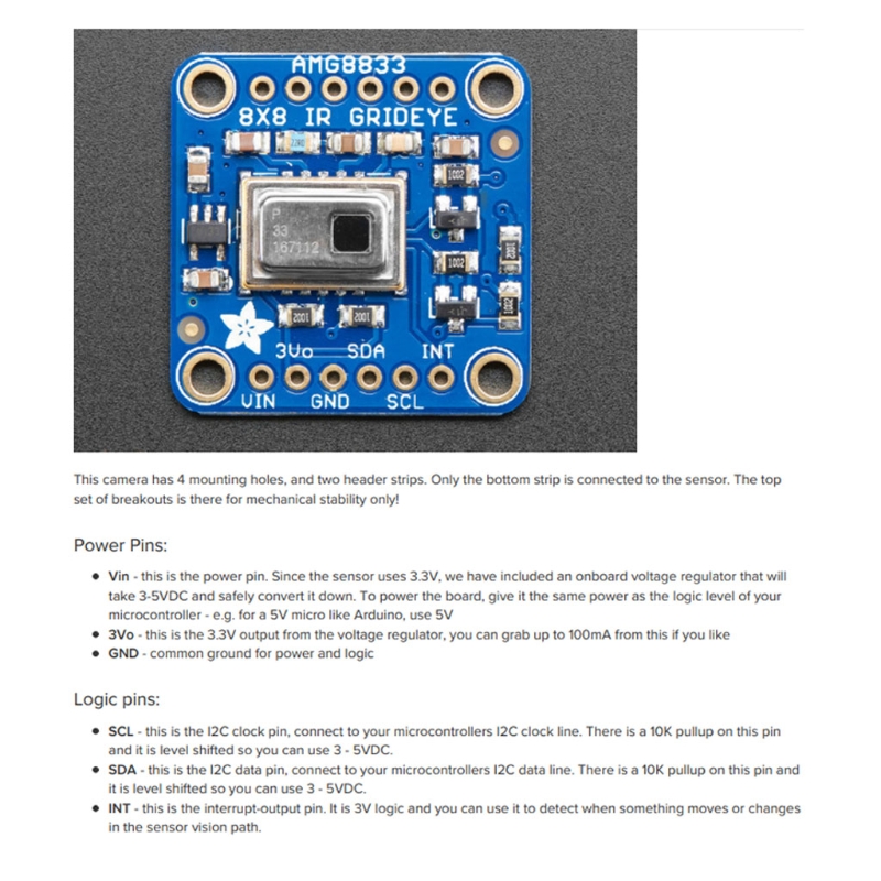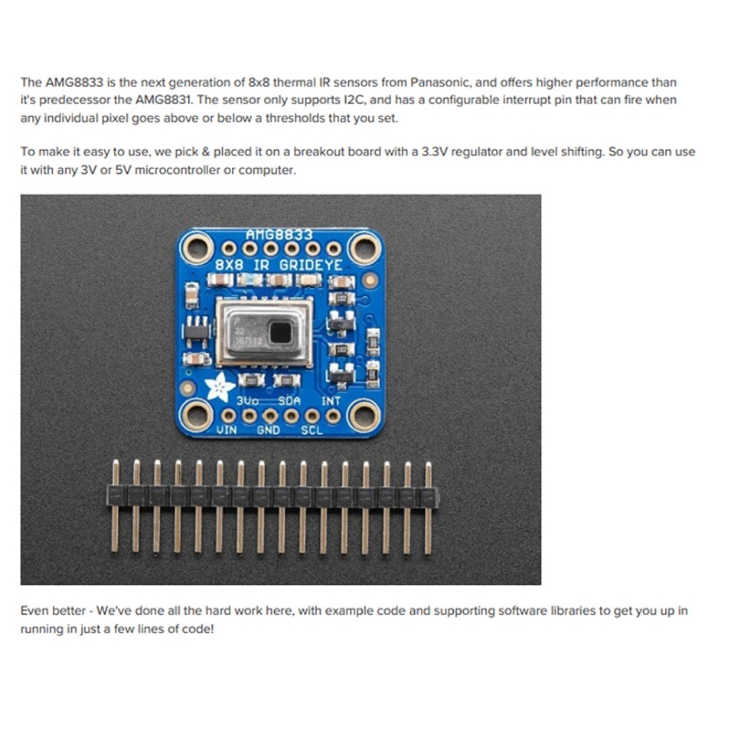 AMG8833 датчик тепловизионной камеры представляет собой ИК-датчик 8x8. При подключении к микроконтроллеру он вернет набор из 64 отдельных инфракрасных показаний температуры через I2C. Это похоже на эти необычные тепловизионные камеры, но компактные и простые для легкой интеграции. Датчик поддерживает только I2C и имеет настраиваемый штырь прерывания, который может срабатывать, когда любой пиксель выше или ниже порога, который вы устанавливаете.
