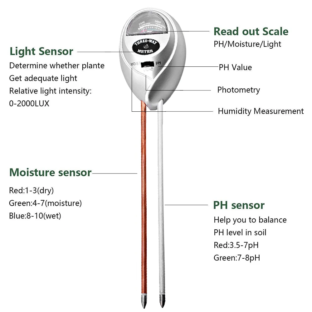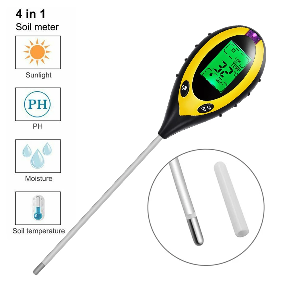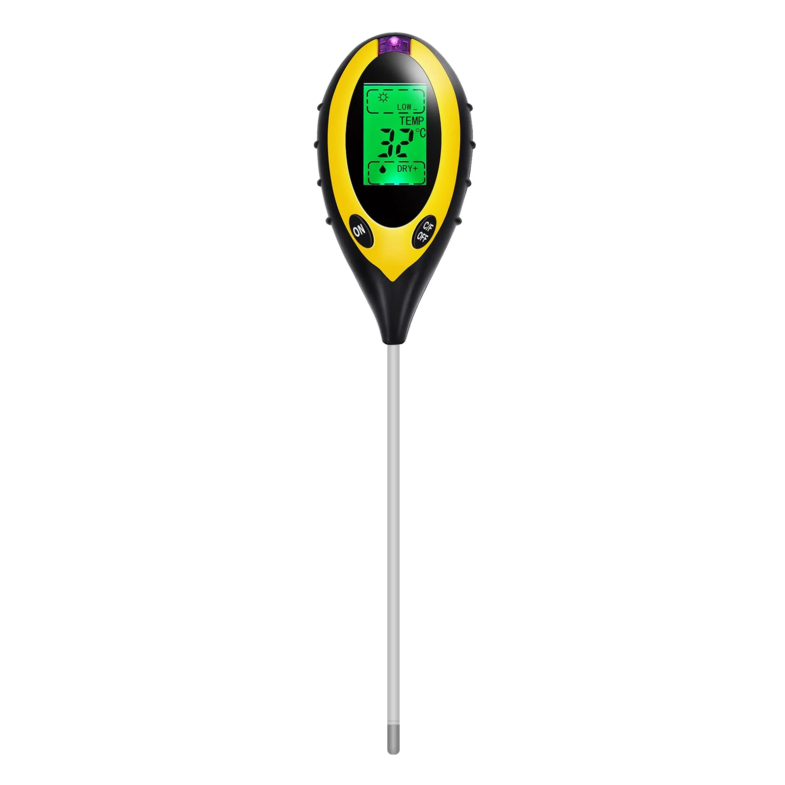 4-в-1 тестер благодаря чему вы можете измерить значение рН почвы (3,0 до 9,5, 10 уровней), интенсивность солнечного света (9 уровней), влаги (5 уровней), влажность (20%-99%) и температура почвы. Это полезно для вас, чтобы контролировать полив, температуру, pH значение солнечного времени для ваших растений, чтобы помочь им расти здоровым и сильным.