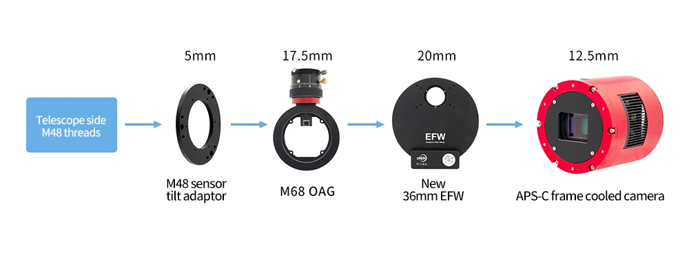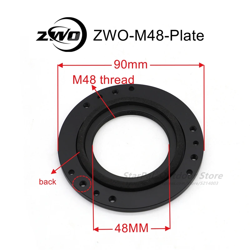 Наклонная пластина датчика M48 Самостоятельно разработана ZWO и специально сделана для соответствия телескопа с резьбой M48. Толщина 5 мм. Он имеет несколько винтовых отверстий на поверхности, так что вы можете легко подключить его к M68 OAG и APS-C и полнокадровой камере, такой как ASI2600/ASI6200/ASI2400.