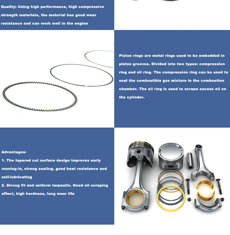Функция поршневого кольца: поршневое кольцо-это металлическое кольцо, которое используется для встраивания в паз поршня. Существует два типа поршневых колец: компрессионное кольцо и масляное кольцо. Компрессионное кольцо может использоваться для уплотнения горючей газовой смеси в камере сгорания; Масляное кольцо используется для очистки избыточного масла на цилиндре.