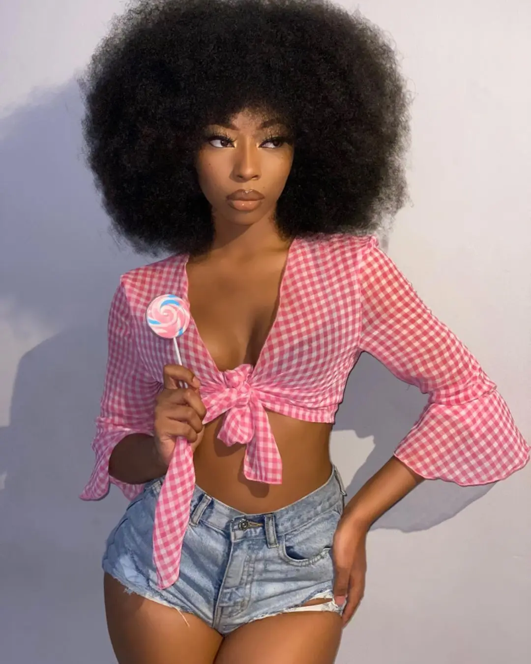 Женский укороченный топ с V-образным вырезом и расширяющимся книзу рукавом на