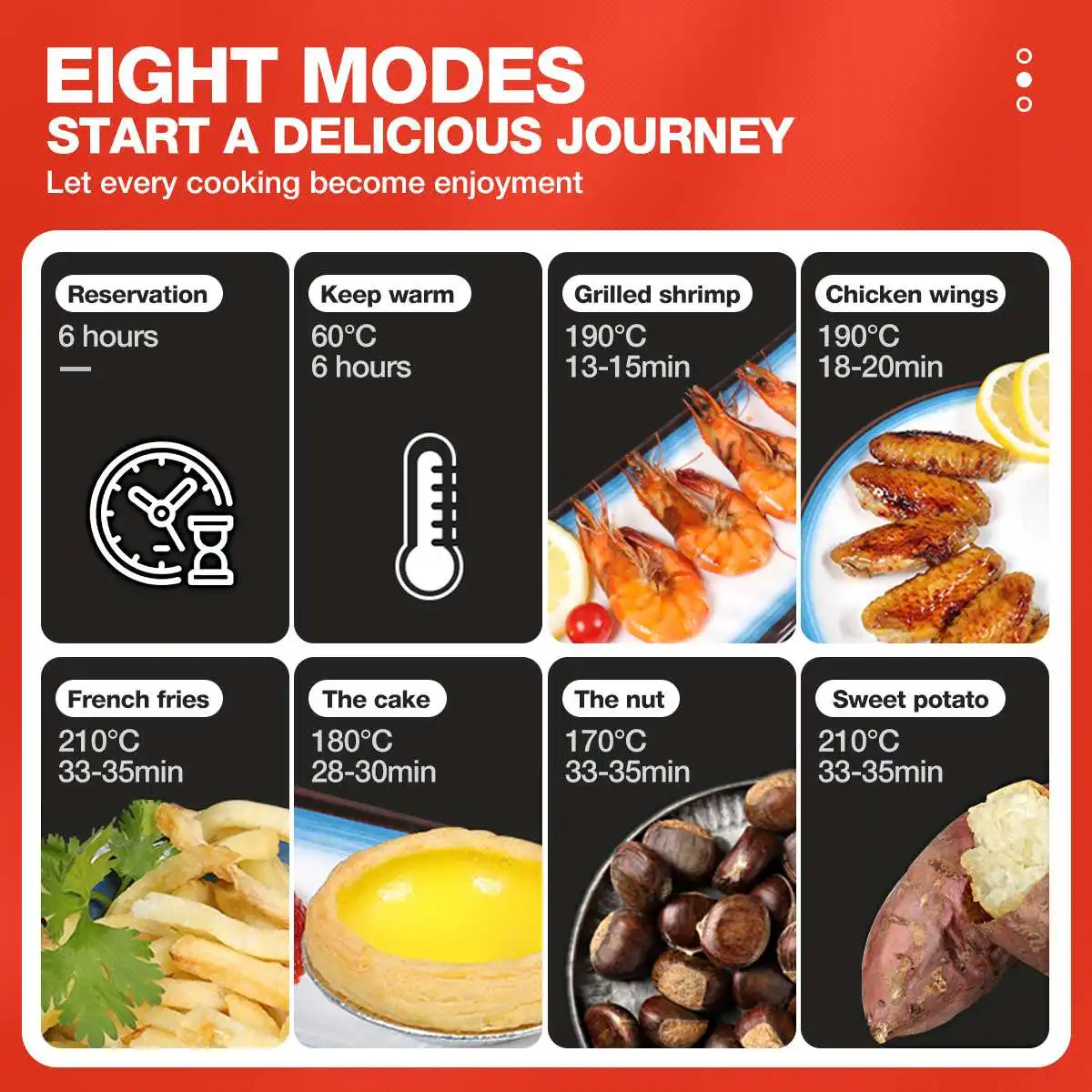 Через нагревательные устройства сверху и снизу воздух в кастрюле быстро нагревается. Под действием мощного вентилятора воздух в сковороде ускоряется, быстро нагревается и ломит ингредиенты, и он может быть здоровым и хорошо жареным, дегустация пищи без добавления масла.