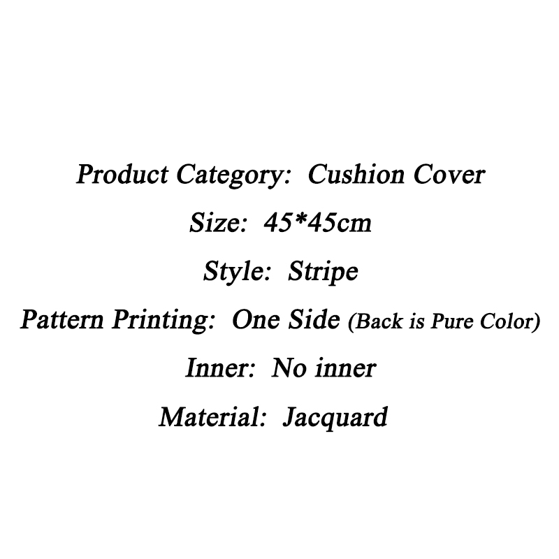 Brand NameMAHOWINGSModel NumberCushion CoverOriginMainland ChinaMaterialJacquard fabricStyleJacquardPattern TypeGeometricis_customizedNoTechnicsWovenShapeSquarePatternEmbroideredSet TypenoUseSeatUseDecorativeUseChairMeasurement unitpiece/piecesEach pack1Product CategoryCushion CoverSize45x45cmMaterialJacquardColorAs PictureInnerNo innerPatternStripeStyleModern simplicity