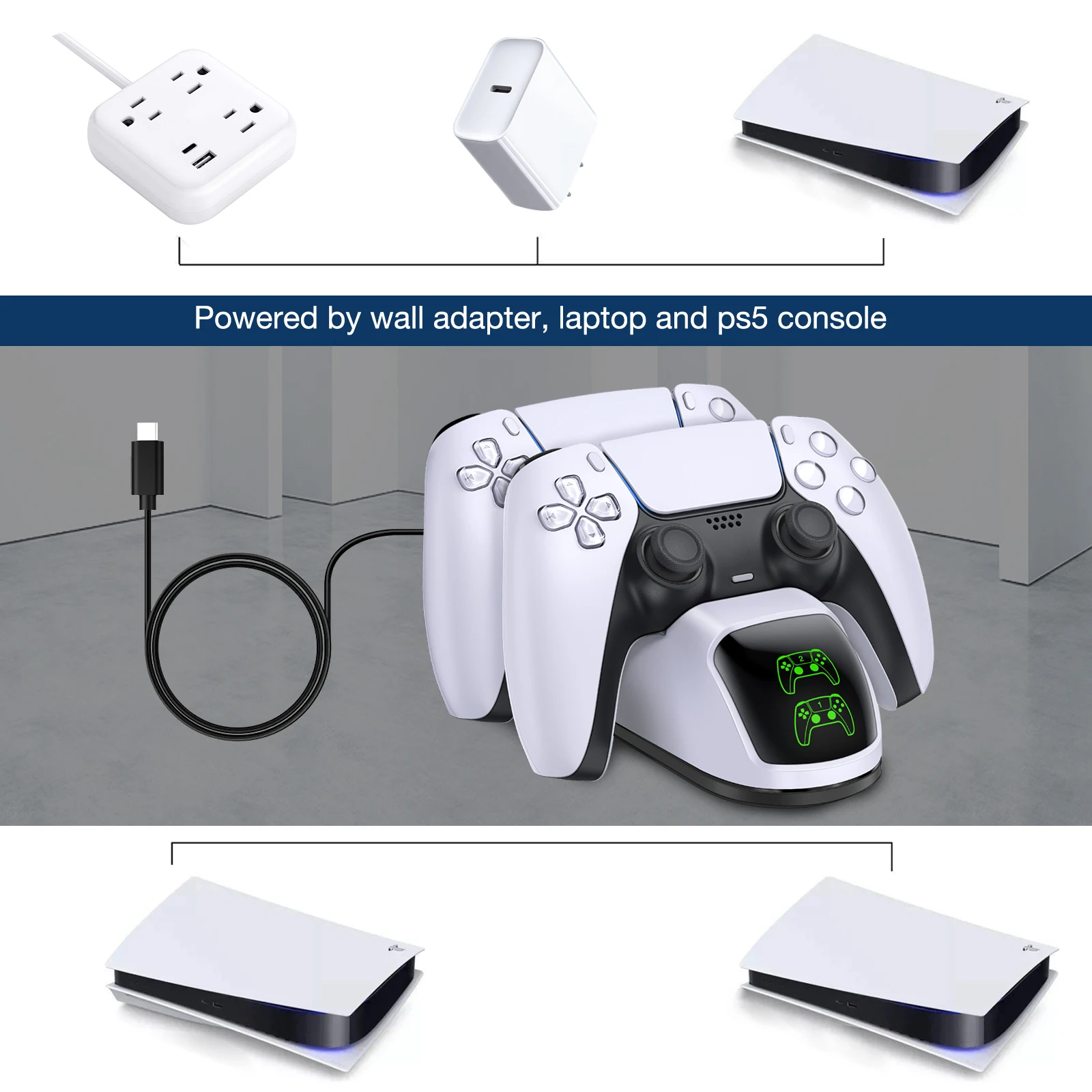 Эта зарядная станция для контроллера ps5 белого цвета совместима с консолью sony ps5, предназначенной для Достаточно легкого питанияОт порта консоли ps5 с подключенным типом c к зарядному кабелю Type-c дополнительный источник питания не требуется. Экономьте время зарядки и наслаждайтесь веселой игрой