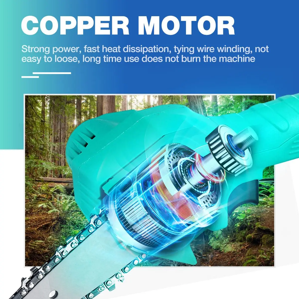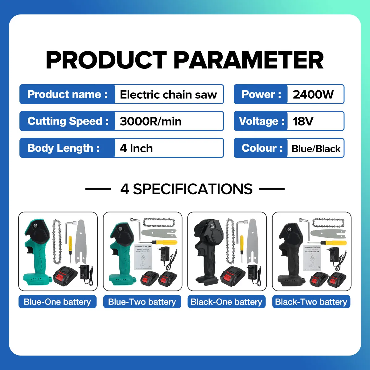 Мини Электрическая цепная пила 18V 2400W для деревообрабатывающий садовые инструменты с батареей цепная пила деревообрабатывающая машина для резки Примечание: При установке цепной пилы, пожалуйста, не устанавливайте цепь слишком плотно, в противном случае двигатель будет легко поврежден при включении машины, что приведет к непригодности продукта. Если у вас возникли проблемы с установкой, пожалуйста, свяжитесь с нами ~ Характеристика: LПерезаряжаемая Электрическая цепная пила, светильник и портативный, длительный срок службы батареи и не повредит кору. LЛегкий корпус, легкий и удобный, легкий дизайн, длительное время держится без усталости рук. LДвигатель из чистой меди, сильная мощность, быстрая скорость резки, повышение эффективности. LПрактичный, быстрый и низкое энергопотребление. LПереключатель высокого качества, регулировка скорости, плавное изменение скорости. LИнтеллектуальная плата управления цепью, защита от перегрузки, для удовлетворения ваших различных потребностей в конструкции. LСпециальная направляющая пластина и шарик из вольфрамовой стали не должны смазываться, поэтому машина может уменьшить сопротивление во время эксплуатации и уменьшить износ машины. LОн компактный и может храниться одной рукой. LВысококачественная направляющая цепь, глубокая закалка, более износостойкая, гладкая резка. Спецификация: Материал: АБС + металл Цвет: черный/синий Батарея: 1/2 * литиевая батарея Батарея, 18В, 10000 мА/ч Мощность: 2400 Вт Длина направляющей пластины: 4 дюйма Скорость цепи: 5 м/с Спецификация: европейский стандарт Посылка: 1 * набор цепной пилы/1 * аксессуары цепной пилы |