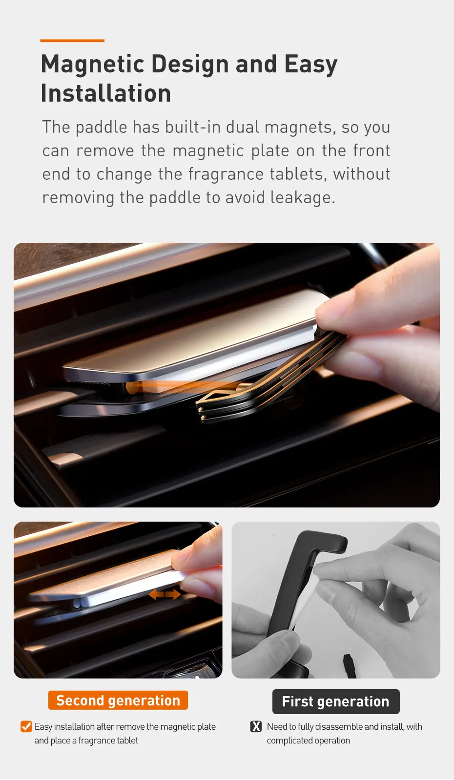 Весло имеет встроенные двойные магниты, так что вы можете удалить магнитную пластину на передней части, чтобы изменить ароматные таблетки, не снимая весло, чтобы избежать утечки.