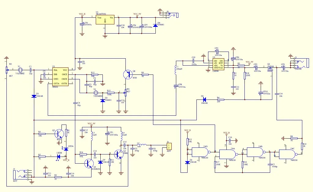 Передающая часть использует осциллирующую цепь ne602, а затем использует 9018 в качестве буфера и усиления, а 9018 также используется в качестве передающего ключа для управления переключением цепи трансивера и сигнала. Заключительный этап-это усилитель класса C, состоящий из D882, а усиленный высокочастотный сигнал проходит через LPF подключает антенну после фильтрации.