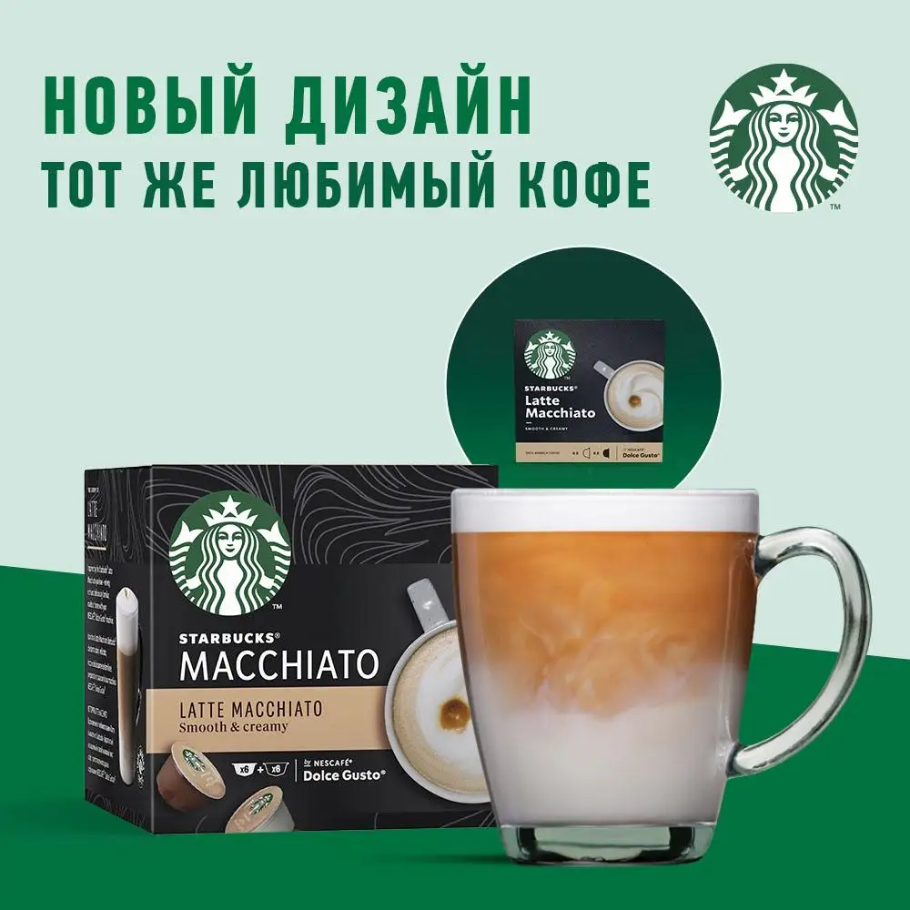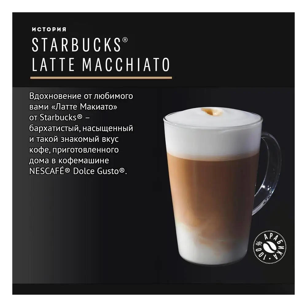 Pamper yourself with moments of happiness, decorated with a delicate coffee foam. Introducing Starbucks latte macchiato for the Nescafé Dolce Gusto system. Inspiration from the favorite guests of latte macchiato coffee from Starbucks-velvety, rich and so familiar taste of coffee, cooked at home in a coffee machine.
