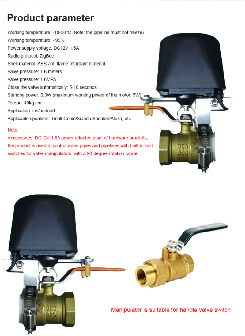 Мощность клапана от TUYA, вы можете закрыть или открыть клапан автоматически со смартфона независимо от того, где вы .. Если вы находитесь вдали от дома, мобильный телефон можно управлять дистанционно, открыть клапан полива для полива сельскохозяйственных угодий, поливать сад и закрыть газовый клапан.