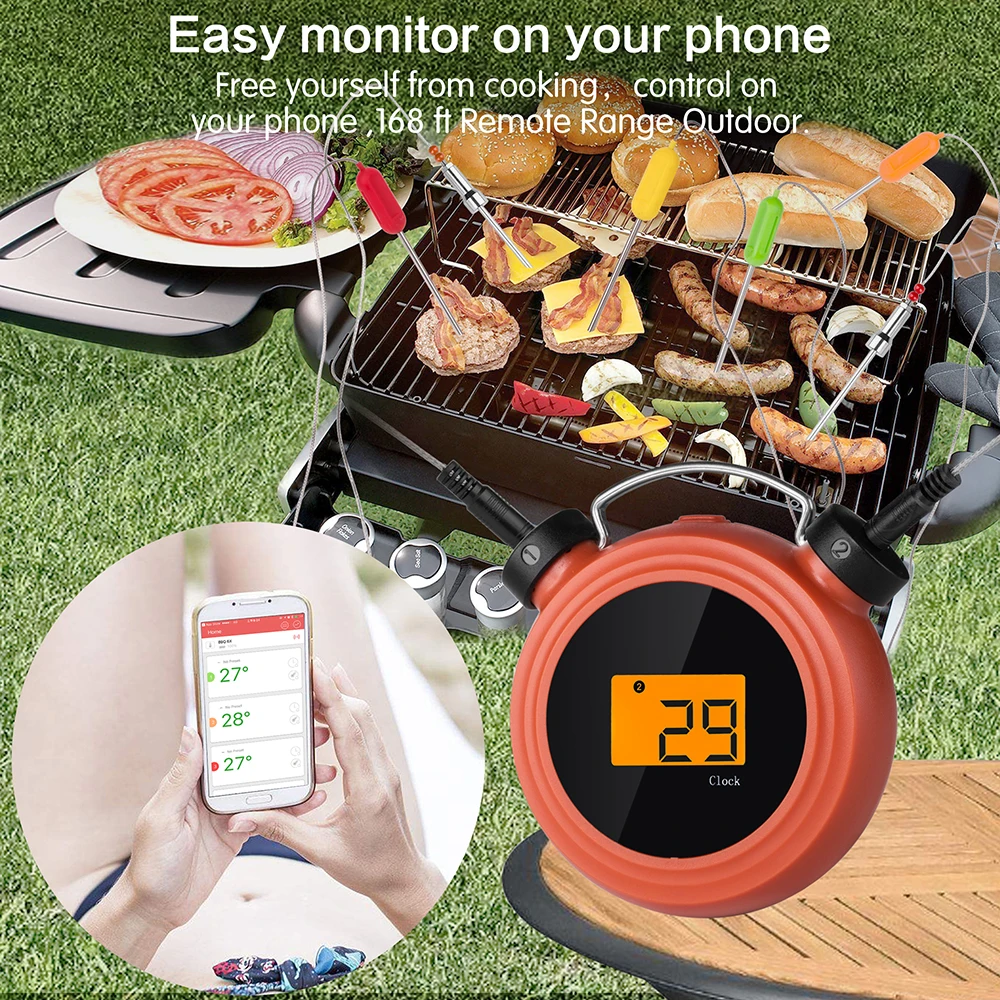 ● Мини-термометр для барбекю оснащен технологией Bluetooth и поставляется с 2 цветными зондами из нержавеющей стали, которые могут использоваться для одновременного чтения двух типов продуктов питания, что делает это устройство чрезвычайно удобным. С ЖК-дисплеем с подсветкой, прием и чтение точной температуры прост даже в самых темных условиях. Все умный дизайн помогает вам готовить, как профессионал!