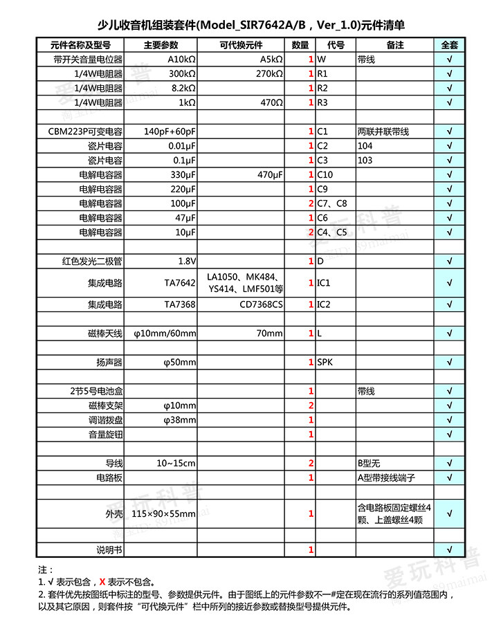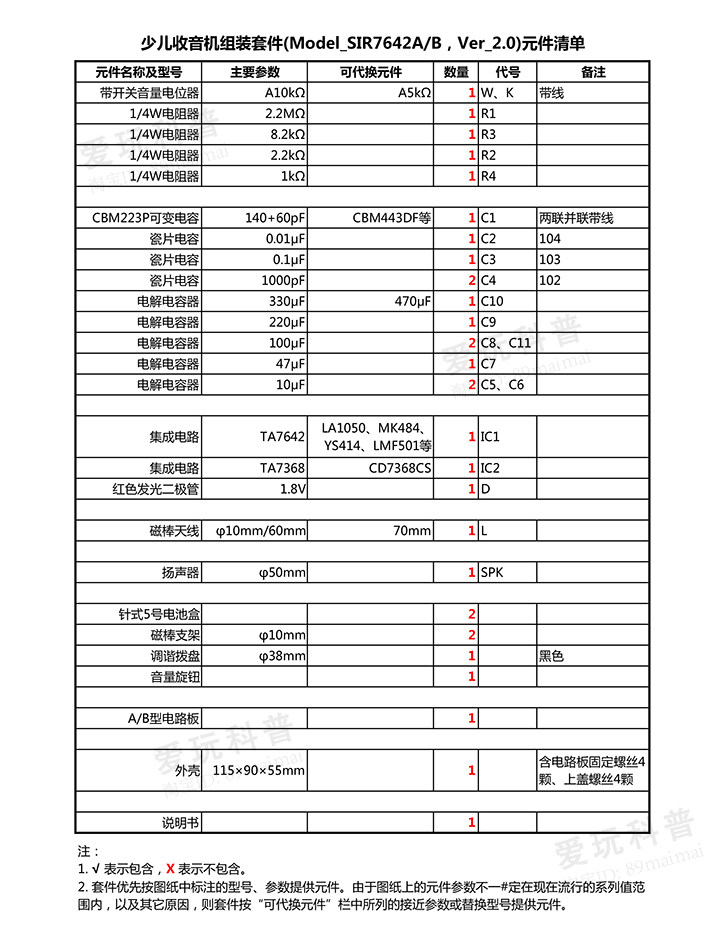 【Декларирование дефектов 】\1.Этот продукт предназначен для обучения детских игрушек способности,Его принцип работы отличается от коммерческого радио,Схема очень простая, несколько компонентов, так что производительность ограничена:(1).Чувствительность не очень высокая, и есть частотаНеравномерная чувствительность высокого и низкого конца, Слабые сигналы не могут быть услышаны или подавлены сильным сигналом станции; \(2).Плохая селективность, когда частоты сигнала двух радиостанций аналогичны, звук будет смешиваться и не может быть выделен (в настоящее время существует несколько средних волновых радиостанций, это не большая проблема);(3). Для сильного и слабого радиосигнала способность контроля баланса слаба, так что некоторые радиостанции очень громкие, некоторые очень маленькие, разница может быть большой. Товарная Машина имеет идеальную функцию автоматического управления, поэтому она звучит так, что все станции имеют одинаковый объем;\ 2. Диафрагма громкоговорителя сделана из шерстяного бумажного волокна, это самая уязвимая часть комплекта, слишком много издевательств заставляет волосы расти, быть поврежденными, не прикасаться слишком сильно, нажмите; 3. Органический переменный конденсатор также является самым слабым компонентом, диапазон вращения оси is0-180degree, не Переворачивайте слишком сильно, в противном случае внутренняя структура будет повреждена. В то же время не прикручивайте винт на переменном конденсаторе до конца, в противном случае нижняя часть винта будет расширяться внутри переменного конденсатора, И верхняя часть лезвия будет деформирована, что приведет к выскабливанию компонентов; \ 4. Корпус изготовлен из пластика, печатная плата крепится на корпусе с саморезами, если саморез слишком туго, пластик треснет и потеряет фиксацию;5. Этот продукт предназначен для достижения цели без сварки, есть много компонентов, которые были обработаны вручную в нашем магазине, он оставит некоторые следы, чтобы он выглядел хуже продуктов завода.
