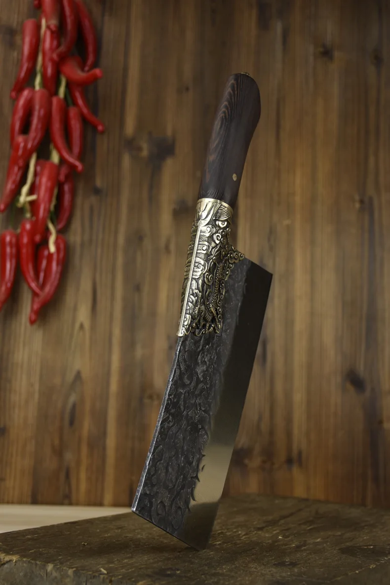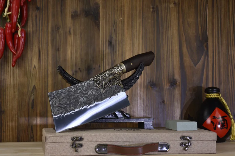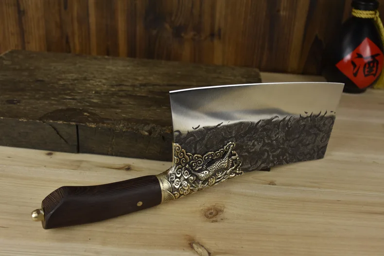 Края острые и легко отполированы, лезвие не ржавеет.Легкий в кости, хорошая кухня или мясо Профессиональный помощникДлина: 33,5 смДлина лезвия: 22 смДлина ручки: 12 смШирина лезвия: 9,6 смТолщина: 0,3 смМатериал лезвия: 4Cr13OV (4 хрома 13 ванадиевая сталь)Материал ручки: розовое деревоПриспособление: чистая медьВес нетто: 938 г