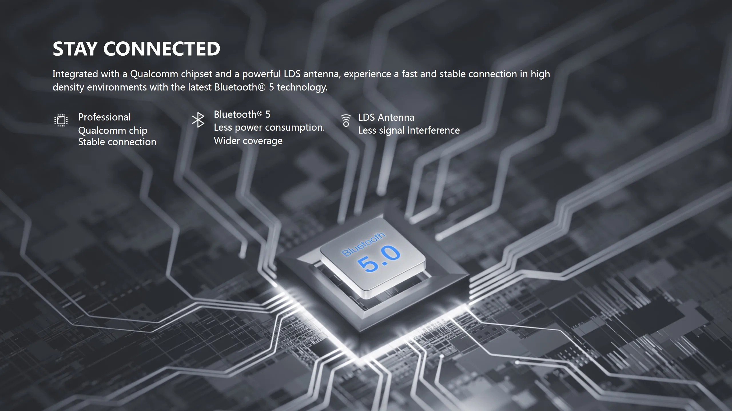 Интегрированный с чипсетом Qualcomm и мощной антенной LDS, обеспечивает быстрое и стабильное соединение в условиях высокой плотности с новейшим Bluetooth®5 технологий.