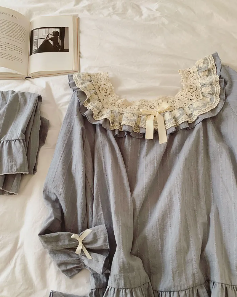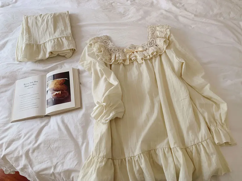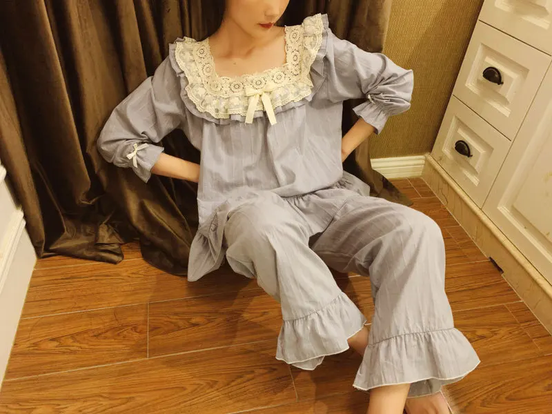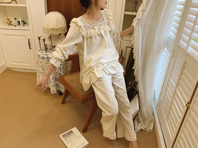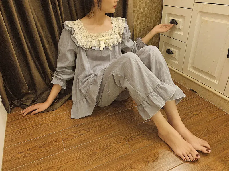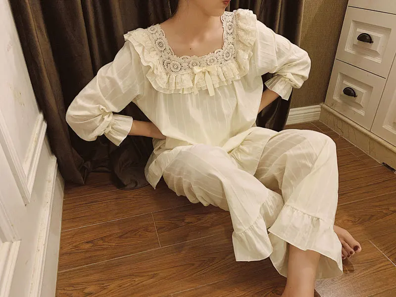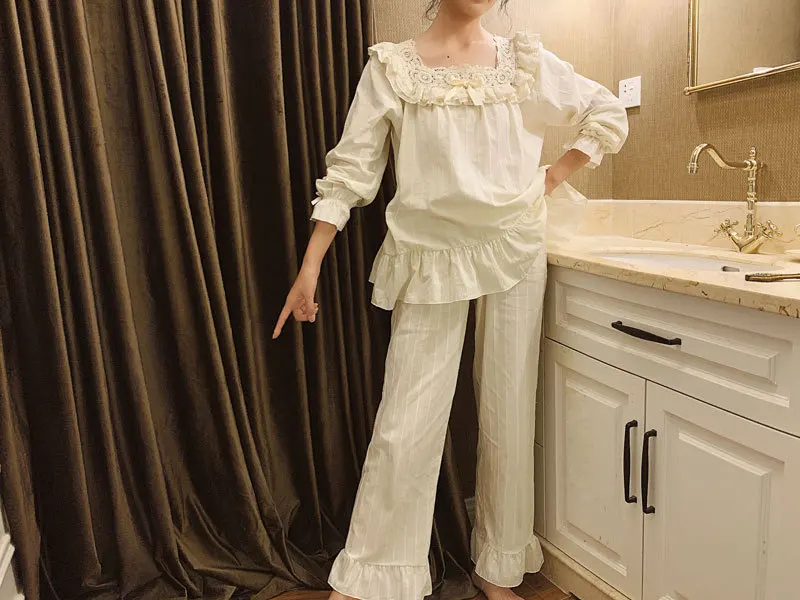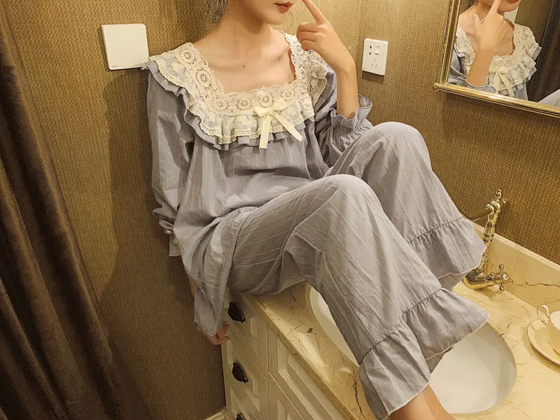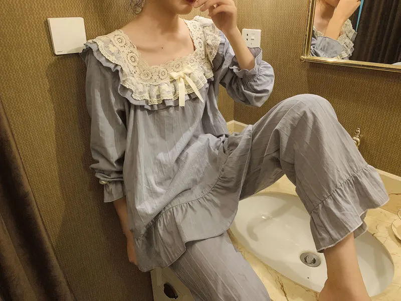 Стильные пижамы принцессы, милые кружевные штаны с длинными рукавами, домашняя одежда, пижамы, женские хлопковые тканые пижамы, домашний комплект