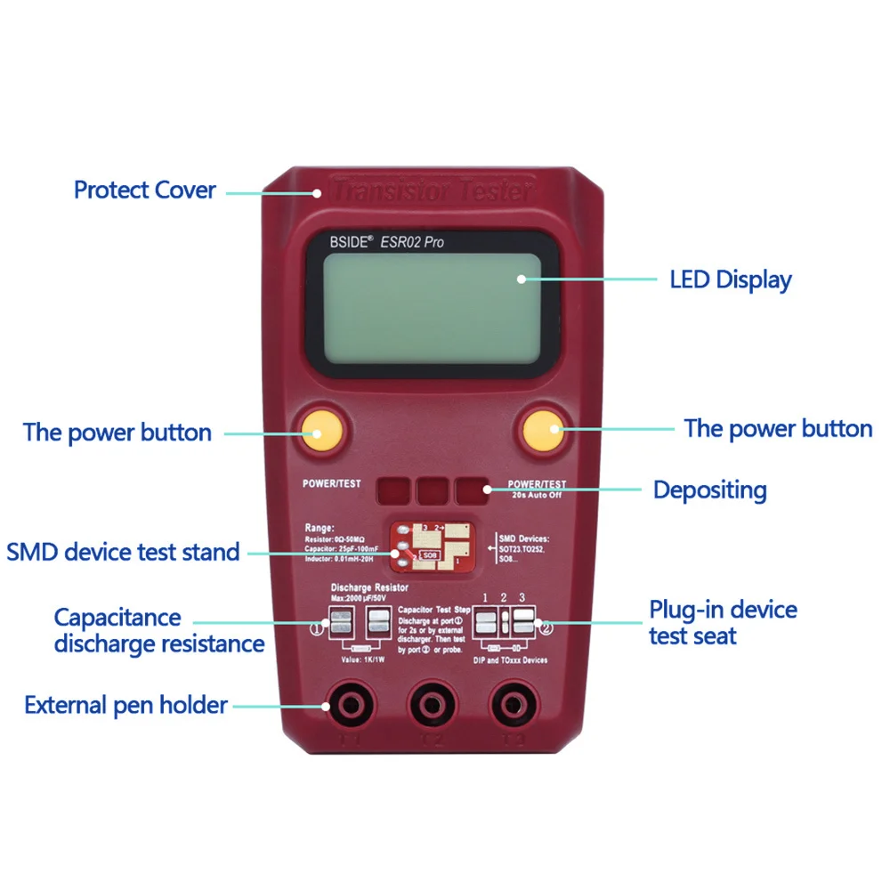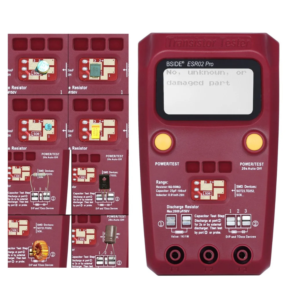 Автоматическое обнаружение NPN и PNP транзисторов N channel и P channel MOSFET диодов (включая двойные диоды) тиристорные Транзисторные резисторы и конденсаторы и другие компоненты.Посылка включает в себя: