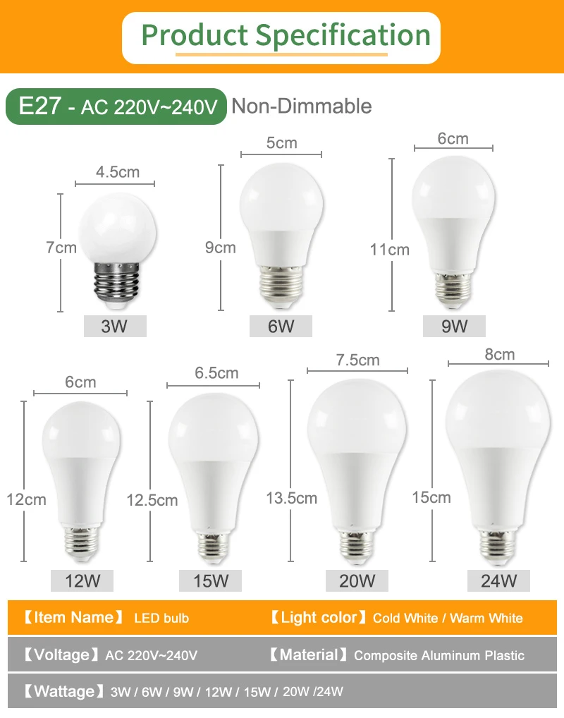 Наименование товара:Светодиодный ная лампочкаТип основания:E27 / E14Напряжение:Переменный ток 220-240 ВМощность:3 Вт/6 Вт/9 Вт/12 Вт/15 Вт/20 Вт/24 ВтЦветовая температура:Теплый белый: 2800-3200K/Холодный белый: 6000-6500KГарантия:1 годИндекс цветопередачи:Ra >85
