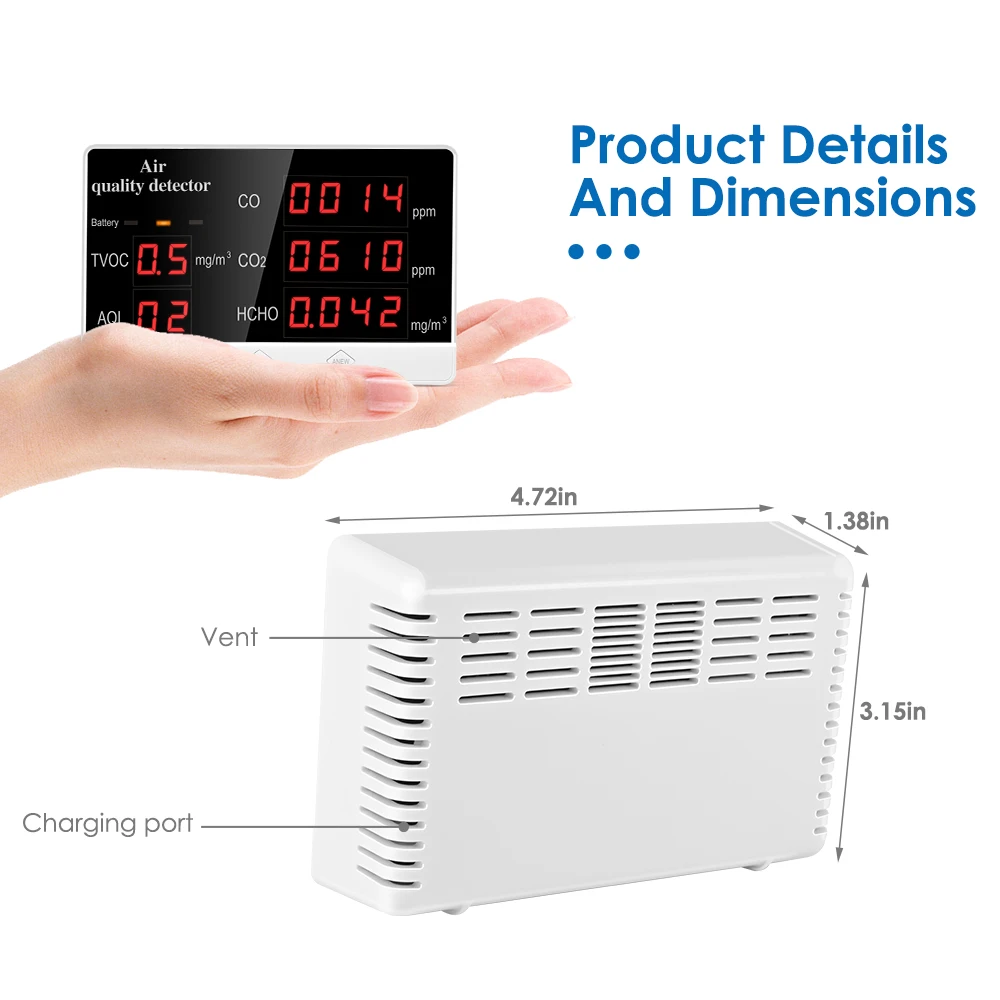 (Кухни, спальни и т. Д.), комнаты для ухода за детьми, отделения, офисы, автомобили, путешествия, кемпинг и вечеринки. Проверяйте качество воздуха в любое время и в любом месте, чтобы не вредить CO2, TVOC, HCHO, haze и т. д.