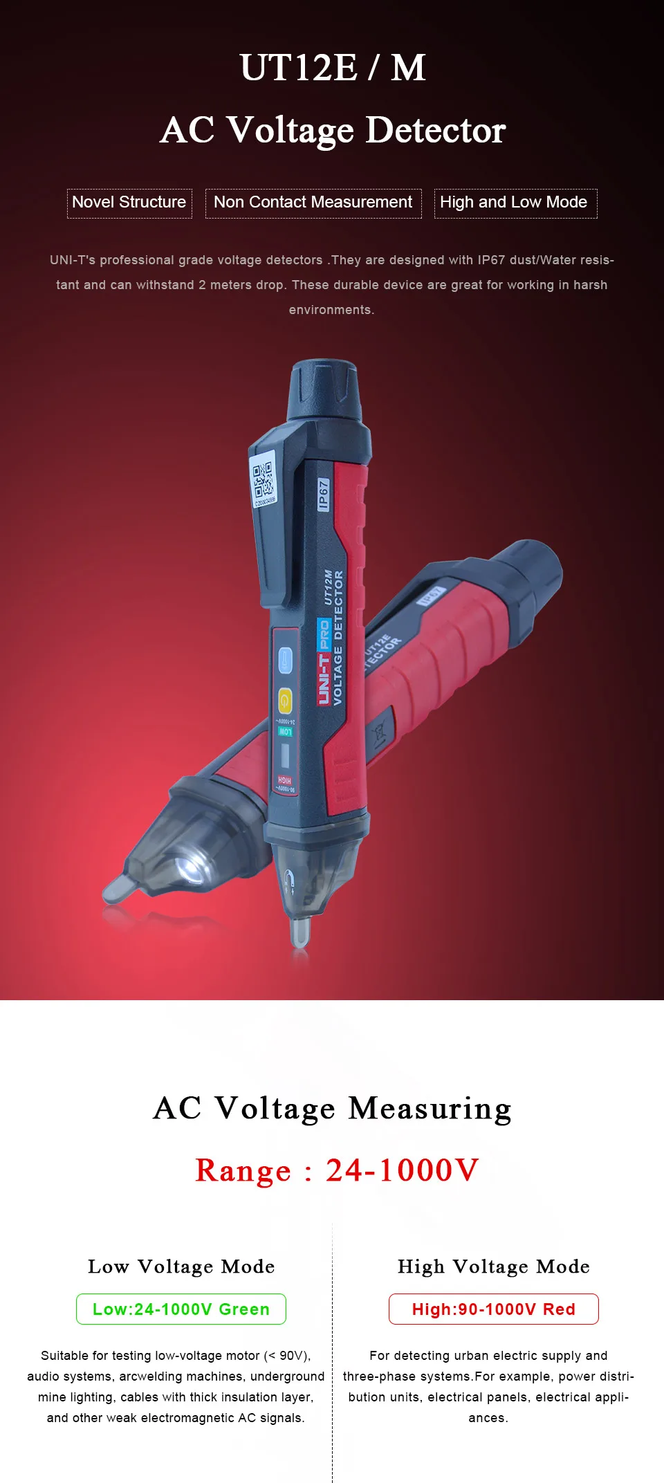 UT12E и UT12M являются профессиональными детекторами напряжения UNI-T. Они разработаны с защитой от пыли/воды IP67 и выдерживают 2 измерения. Эти прочные устройства отлично подходят для работы в суровых условиях. UT12E имеет дополнительный режим вибрации иUT12M способен обнаруживать магнитное покрытие.