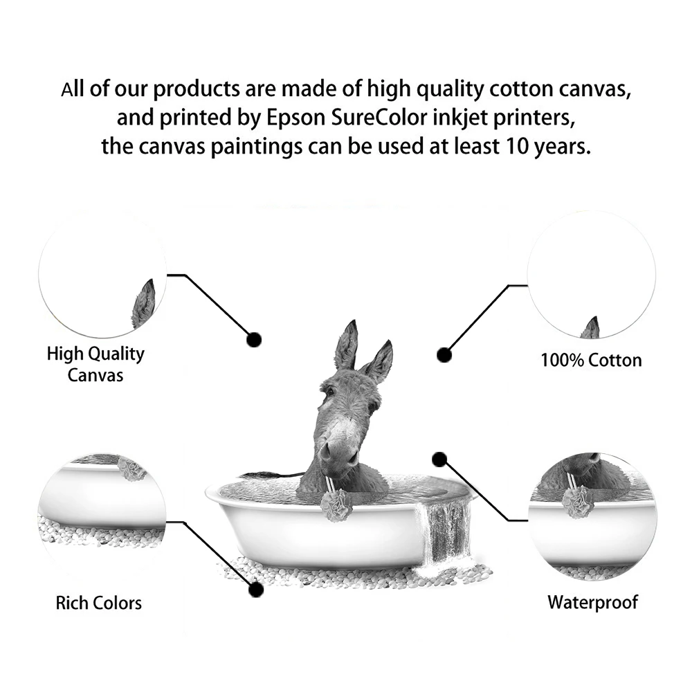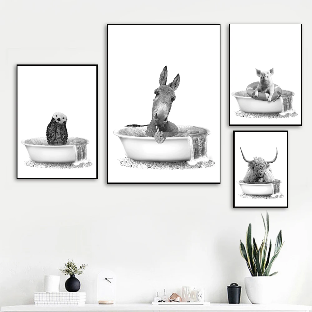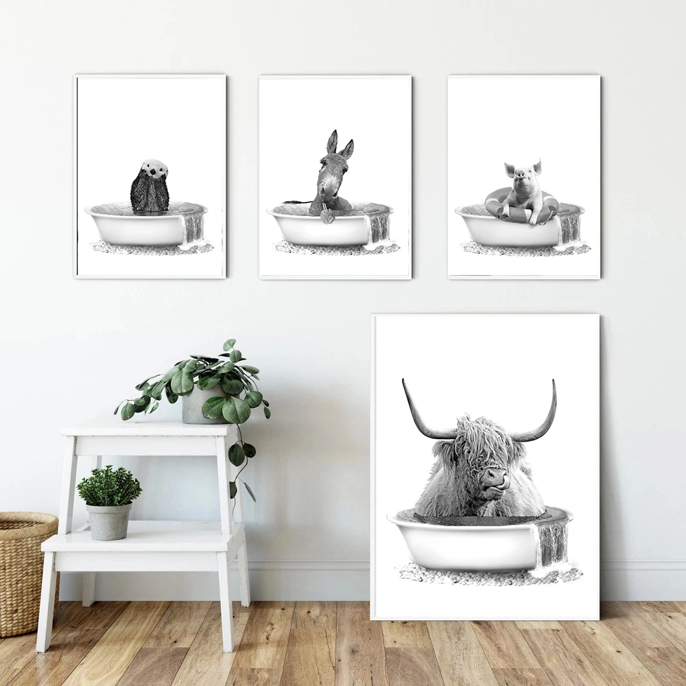 Животное в ванной постер печать Забавный нагорье корова свинья Ослик Ванна холст картины настенные картины для детской комнаты декор для детской комнаты