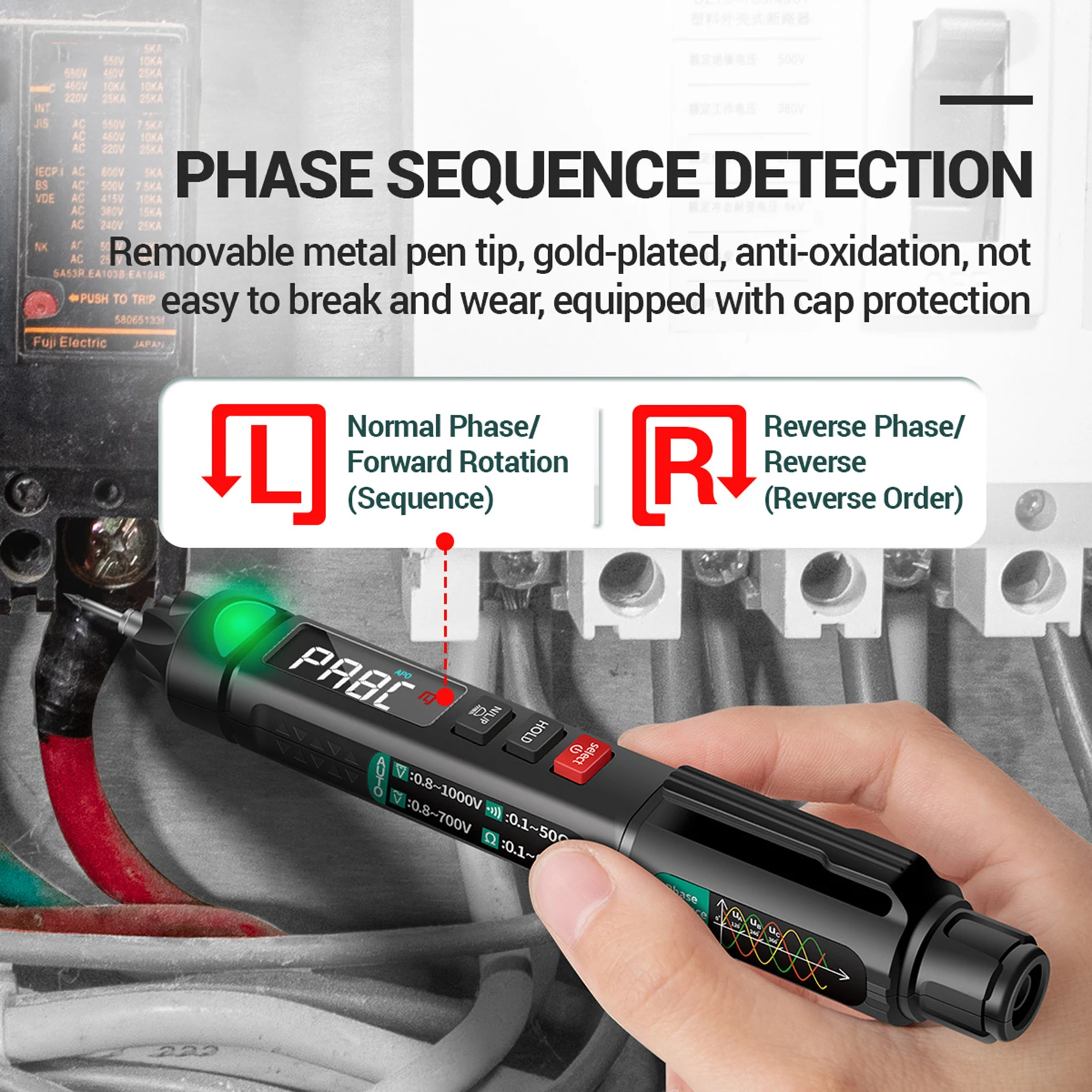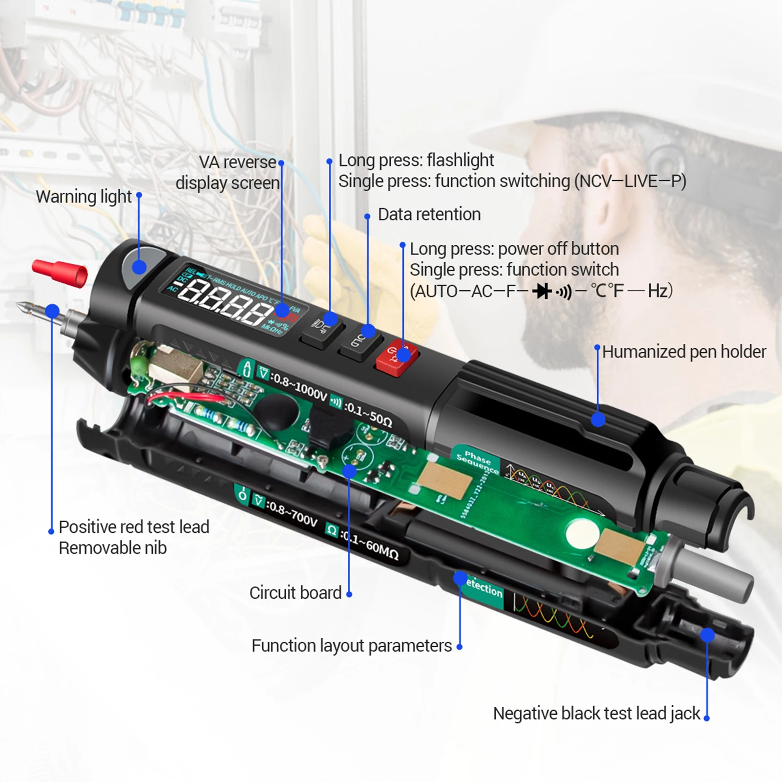 Универсальный мультиметр ручки:Этот мультиметр оснащен испытанием напряжения/сопротивления/емкости/диода/частоты/температуры, непрерывности, нулевой линии и бесконтактной фазы обнаружения последовательности и т. Д.
