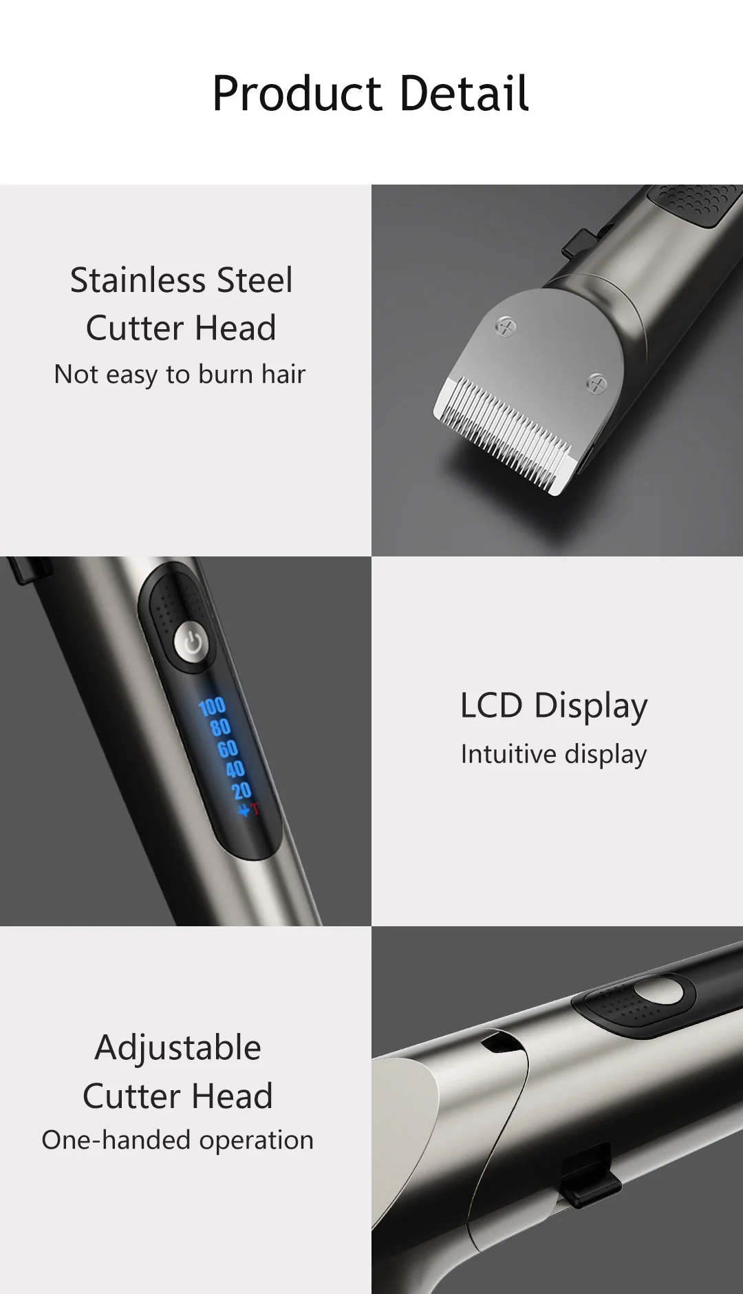 ● Режущая головка из нержавеющей стали нелегко сжечь волосы ● ЖК-дисплей интуитивно понятный дисплей ● Регулируемая режущая головка с одной рукой