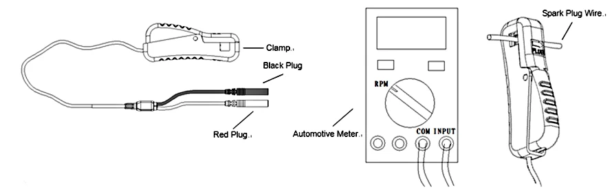 🔱【Простые в эксплуатации ступени】-Зажмите Провод Свечи зажигания меткой «→» на Индуктивный звукосниматель, указывая на свечу зажигания для измерения частоты вращения двигателя.
